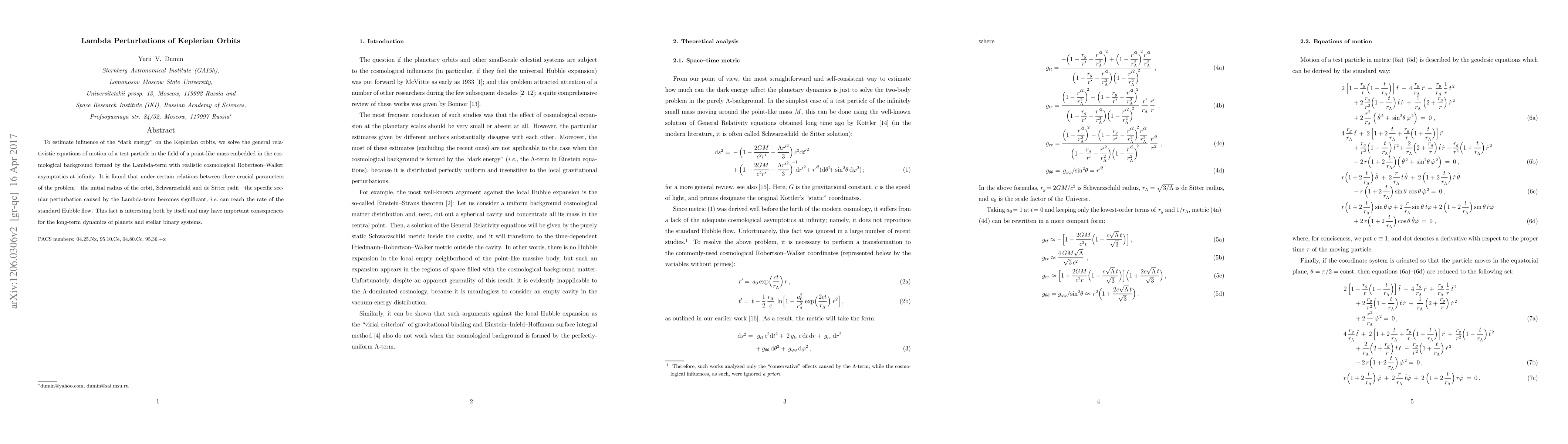 To estimate influence of the "dark energy" on the Keplerian orbits, we solve the general relativistic equations of motion of a test particle in the field of a point-like mass embedded in the cosmological background formed by the Lambda-term with realistic cosmological Robertson-Walker asymptotics at infinity. It is found that under certain relations between three crucial parameters of the problem--the initial radius of the orbit, Schwarzschild and de Sitter radii--the specific secular perturbation caused by the Lambda-term becomes significant, i.e. can reach the rate of the standard Hubble flow. This fact is interesting both by itself and may have important consequences for the long-term dynamics of planets and stellar binary systems.