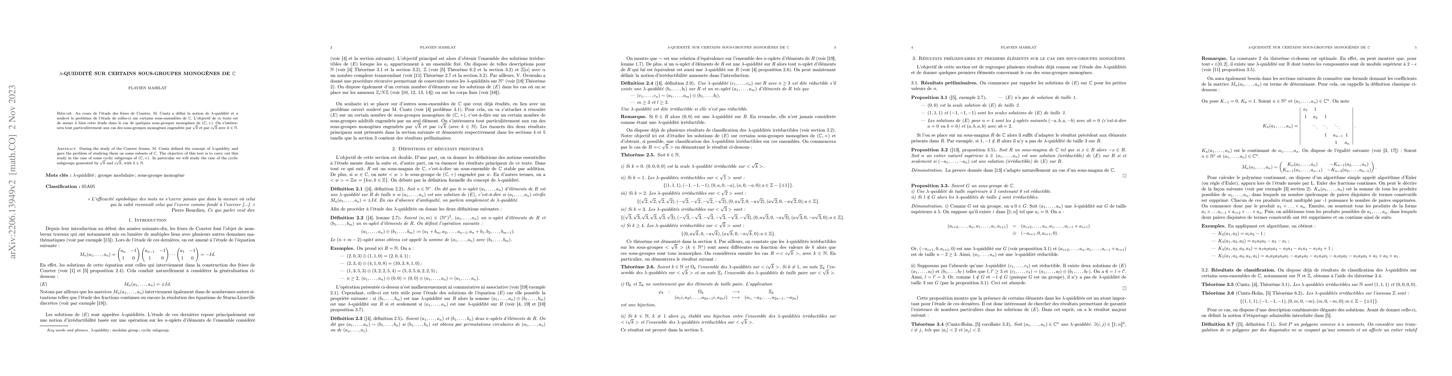 During the study of the Coxeter friezes, M. Cuntz defined the concept of $\lambda$-quiddity and gave the problem of studying them on some subsets of $\mathbb{C}$. The objective of this text is to carry out this study in the case of some cyclic subgroups of ($\mathbb{C},+$). In particular we will study the case of the cyclic subgroups generated by $\sqrt{k}$ and $i\sqrt{k}$, with $k \in \mathbb{N}$.