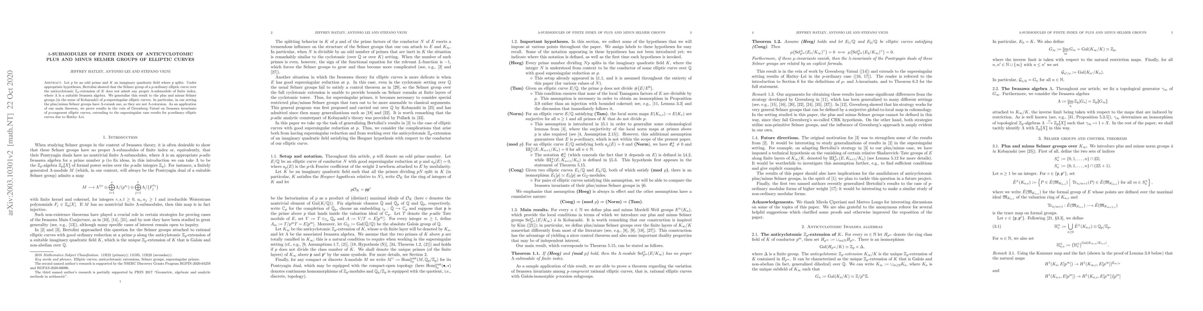 This paper generalizes Bertolini's result on the non-existence of proper $\Lambda$-submodules of finite index in Selmer groups to $p$-supersingular elliptic curves over an anticyclotomic $\mathbb Z_p$-extension of an imaginary quadratic field. The study reveals that plus and minus Selmer groups have $\Lambda$-corank one, establishing their non-$\Lambda$-cotorsion nature and extending Greenberg-Vatsal's Iwasawa invariants results to the supersingular case.