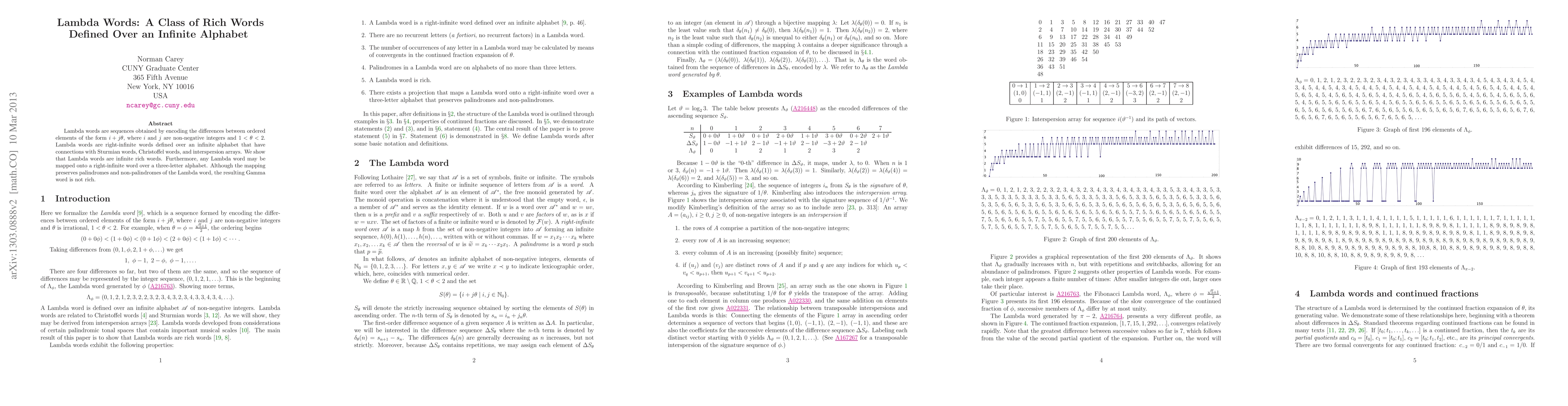 Lambda words are sequences obtained by encoding the differences between ordered elements of the form i+j\theta, where i and j are non-negative integers and 1 < \theta <2. Lambda words are right-infinite words defined over an infinite alphabet that have connections with Sturmian words, Christoffel words, and interspersion arrays. We show that Lambda words are infinite rich words. Furthermore, any Lambda word may be mapped onto a right-infinite word over a three-letter alphabet. Although the mapping preserves palindromes and non-palindromes of the Lambda word, the resulting Gamma word is not rich.
