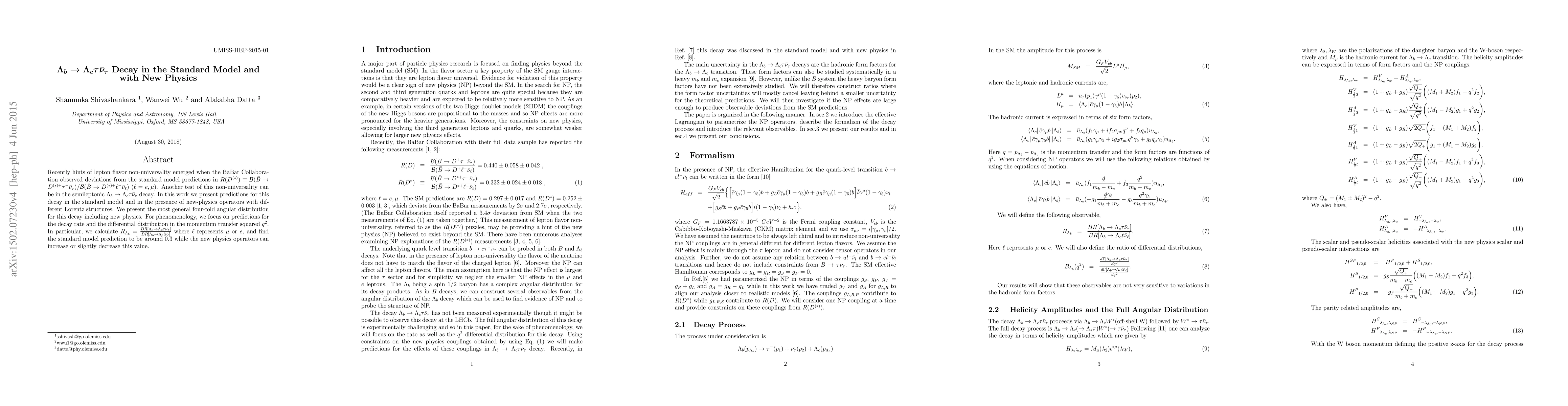 This paper investigates the $\Lambda_b \to \Lambda_c \tau \bar{\nu}_{\tau}$ decay in the Standard Model and explores its deviations due to new physics. It predicts the decay rate and differential distribution in $q^2$, finding that while the Standard Model predicts a ratio $R_{\Lambda_{b}}$ of around $0.3$, new physics could slightly alter this value.