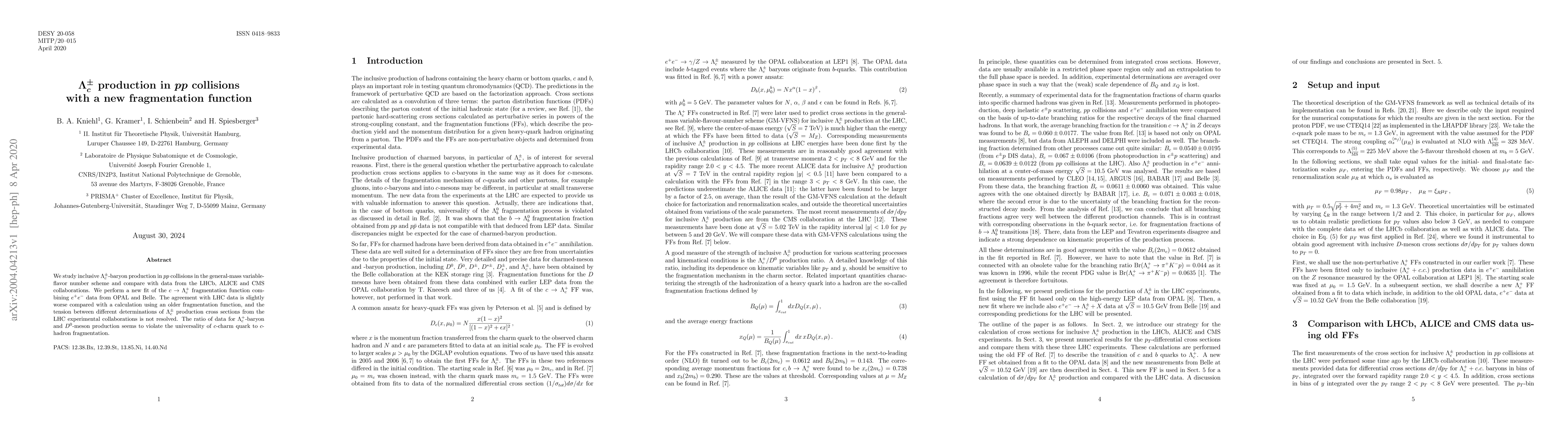 This paper investigates $\Lambda_c^{\pm}$ baryon production in proton-proton collisions using a new fragmentation function, finding slightly worse agreement with LHC data compared to older models, and noting a discrepancy in the universality of charm quark fragmentation.