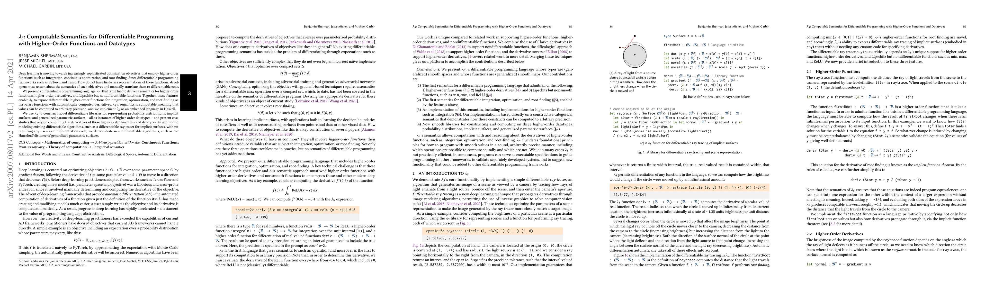 The paper introduces $\lambda_S$, a differentiable programming language that provides a computable semantics for higher-order functions and datatypes, enabling automatic differentiation for complex optimization tasks like integration and continuous optimization. The language facilitates constructing differentiable libraries for advanced applications such as probabilistic models and implicit surfaces.