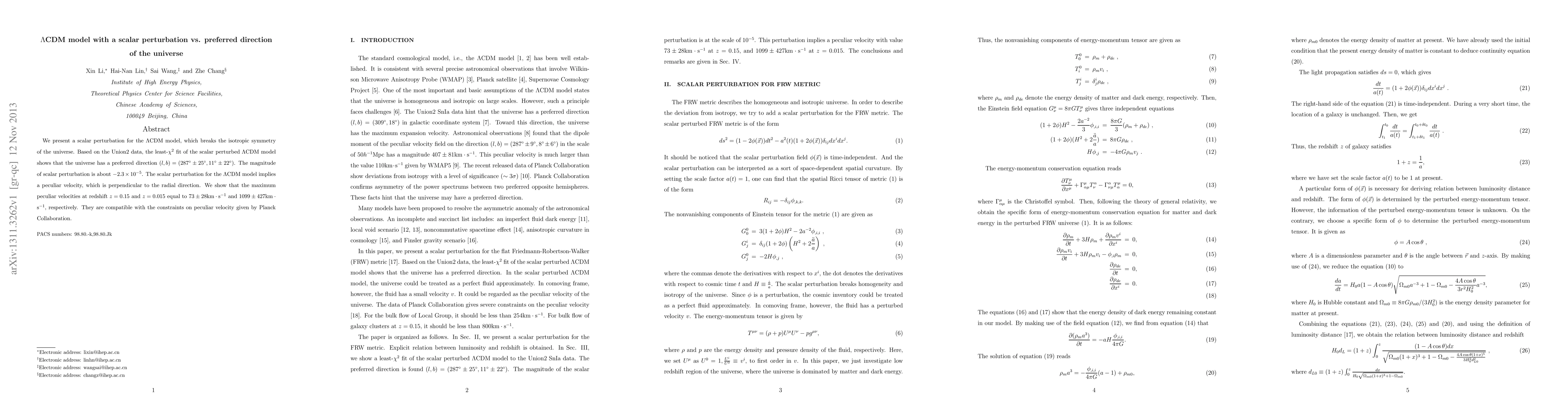 We present a scalar perturbation for the $\Lambda$CDM model, which breaks the isotropic symmetry of the universe. Based on the Union2 data, the least-$\chi^2$ fit of the scalar perturbed $\Lambda$CDM model shows that the universe has a preferred direction $(l,b)=(287^\circ\pm25^\circ,11^\circ\pm22^\circ)$. The magnitude of scalar perturbation is about $-2.3\times10^{-5}$. The scalar perturbation for the $\Lambda$CDM model implies a peculiar velocity, which is perpendicular to the radial direction. We show that the maximum peculiar velocities at redshift $z=0.15$ and $z=0.015$ equal to $73\pm28 \rm km\cdot s^{-1}$ and $1099\pm427 \rm km\cdot s^{-1}$, respectively. They are compatible with the constraints on peculiar velocity given by Planck Collaboration.
