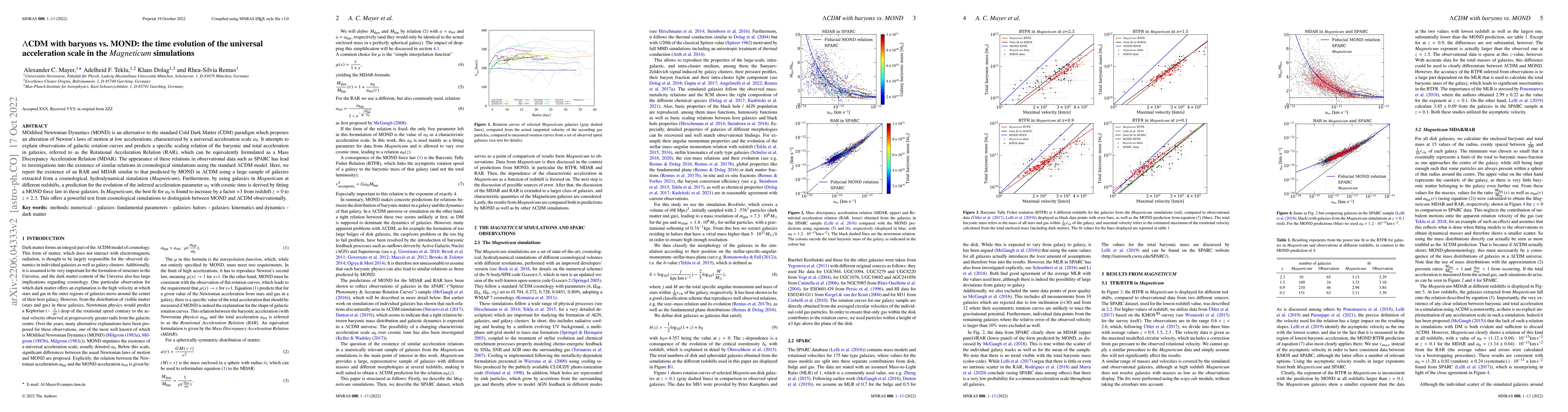 This paper investigates the time evolution of the universal acceleration scale in the Magneticum simulations, comparing the predictions of MOdified Newtonian Dynamics (MOND) with the standard Cold Dark Matter (\(\Lambda\)CDM) model. It finds a MOND-like Rotational Acceleration Relation (RAR) in \(\Lambda\)CDM simulations, with the acceleration parameter \(a_0\) increasing by a factor of approximately 3 from redshift z = 0 to z = 2, providing a potential observational test to distinguish between MOND and \(\Lambda\)CDM.