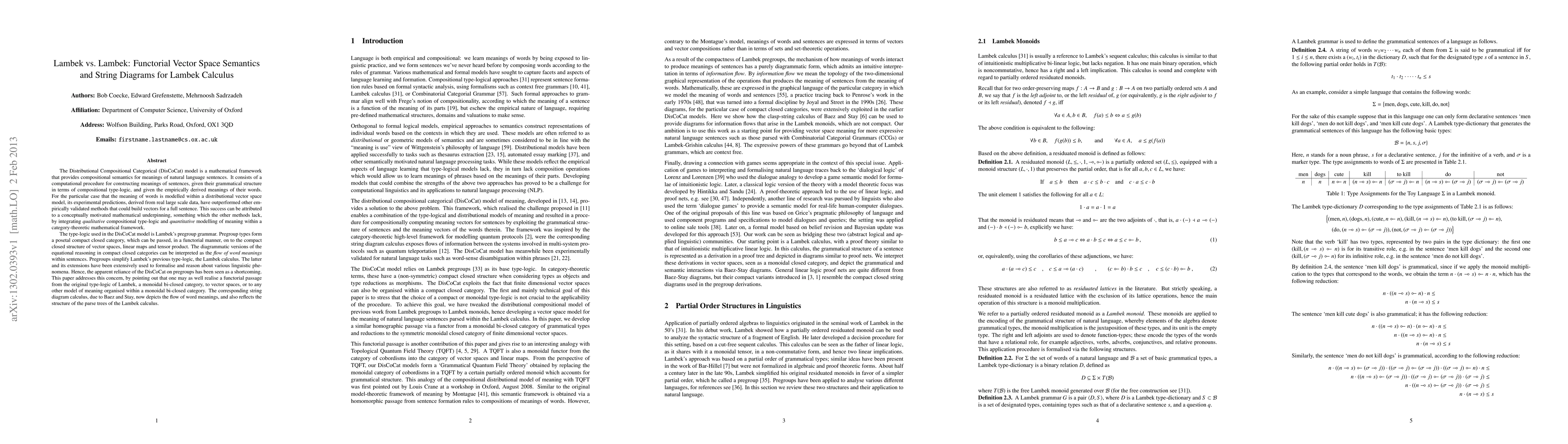 This paper explores the functorial passage from Lambek's original type-logic to vector spaces using string diagrams, addressing the perceived shortcoming of the DisCoCat model's reliance on pregroup grammar. It demonstrates that the flow of word meanings can be depicted using the string diagram calculus, offering an alternative to pregroup types.