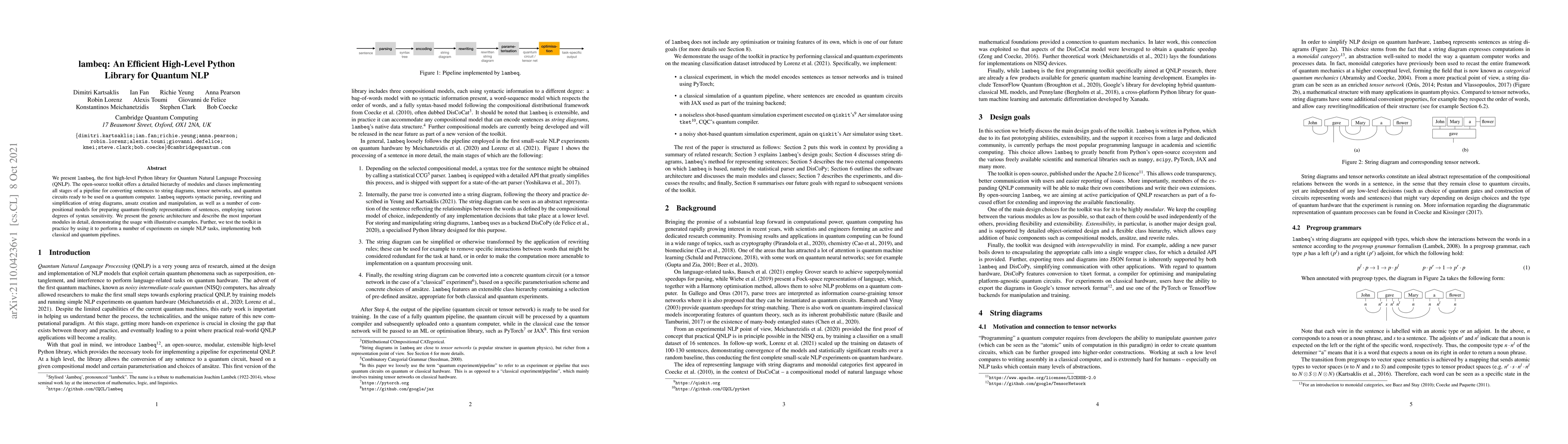Lambeq is an open-source Python library for Quantum Natural Language Processing (QNLP) that facilitates the conversion of sentences into quantum-friendly formats. It provides modules for syntactic parsing, diagram simplification, ansatz creation, and compositional models for quantum representations, demonstrated through practical NLP experiments.