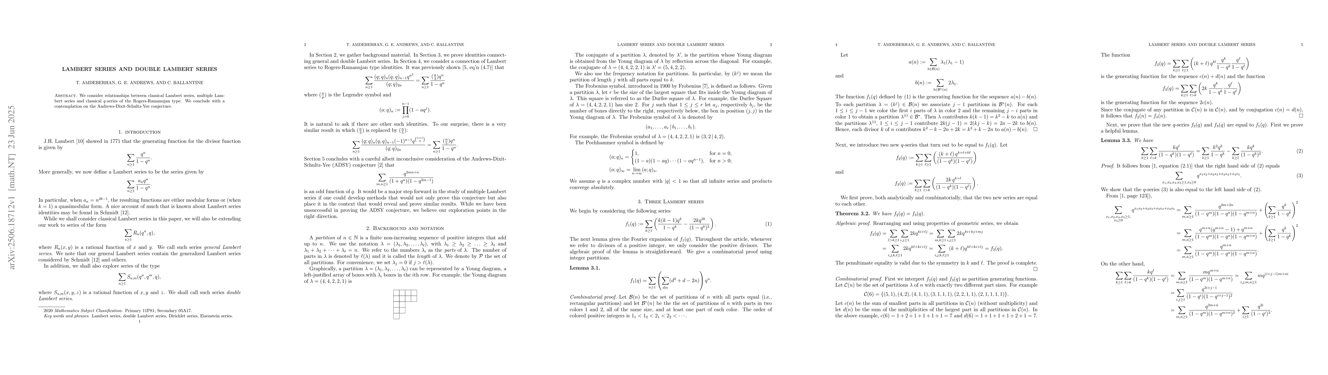 We consider relationships between classical Lambert series, multiple Lambert series and classical $q$-series of the Rogers-Ramanujan type. We conclude with a contemplation on the Andrews-Dixit-Schultz-Yee conjecture.