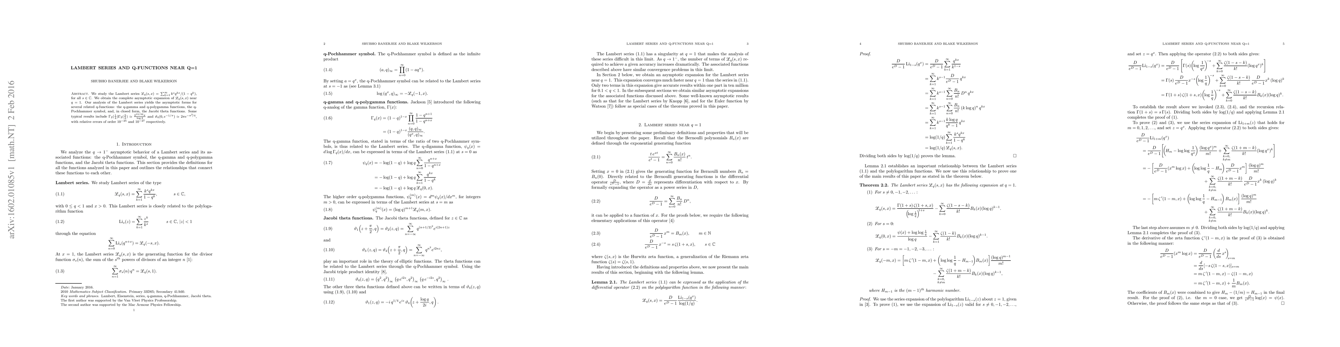 We study the Lambert series $\mathscr{L}_q(s,x) = \sum_{k=1}^\infty k^s q^{k x}/(1-q^k)$, for all $s \in \mathbb{C}$. We obtain the complete asymptotic expansion of $\mathscr{L}_q(s,x)$ near $q=1$. Our analysis of the Lambert series yields the asymptotic forms for several related q-functions: the q-gamma and q-polygamma functions, the q-Pochhammer symbol, and, in closed form, the Jacobi theta functions. Some typical results include $\Gamma_2(\frac{1}{4}) \Gamma_2(\frac{3}{4}) \simeq \frac{2^{13/32} \pi}{\log 2}$ and $\vartheta_4 (0,e^{-1/\pi}) \simeq 2 \pi e^{-\pi^3\!/4}$, with relative errors of order $10^{-25}$ and $10^{-27}$ respectively.