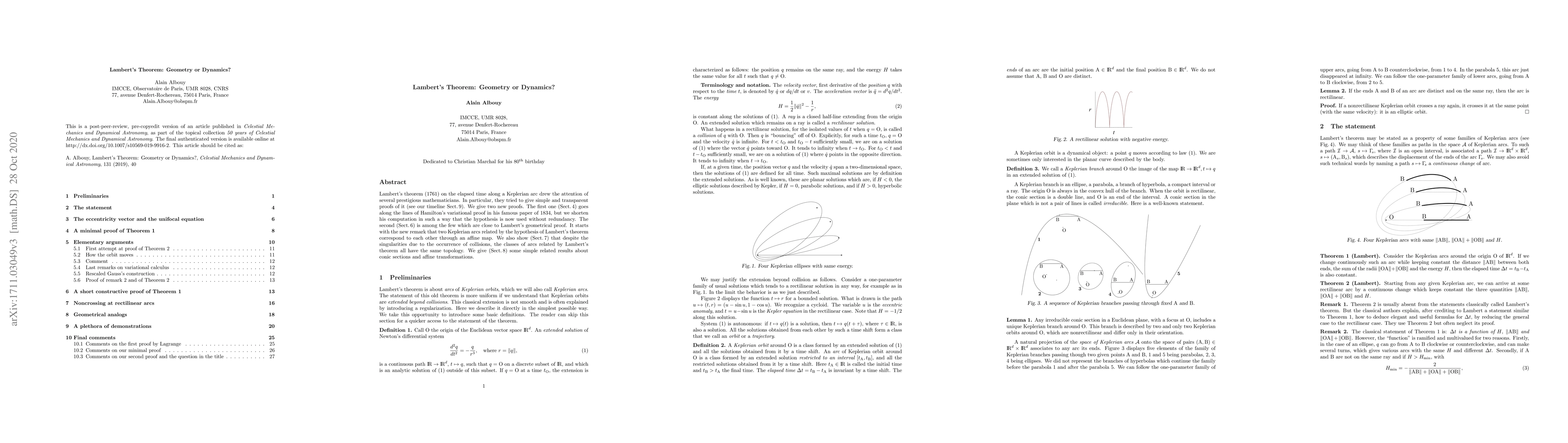 Researchers provide two new proofs for Lambert's theorem, a 1761 mathematician's insight on time along Keplerian arcs, shedding light on its geometry and dynamics, while also exploring related topological properties of the arcs.