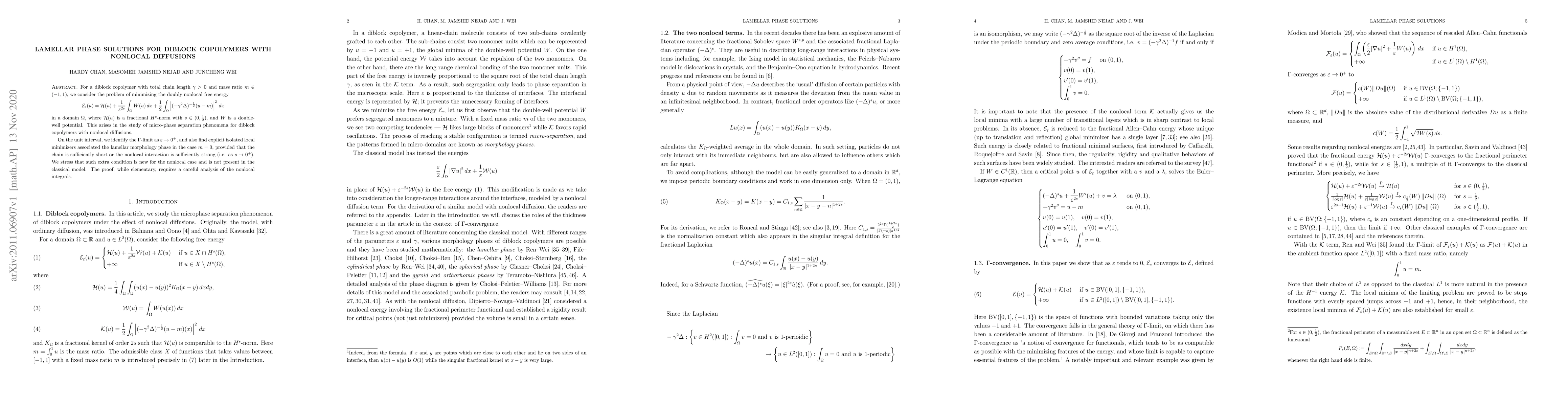 Researchers studied minimizing a doubly nonlocal free energy for diblock copolymers with nonlocal diffusions, finding explicit minimizers for lamellar morphology under certain conditions.