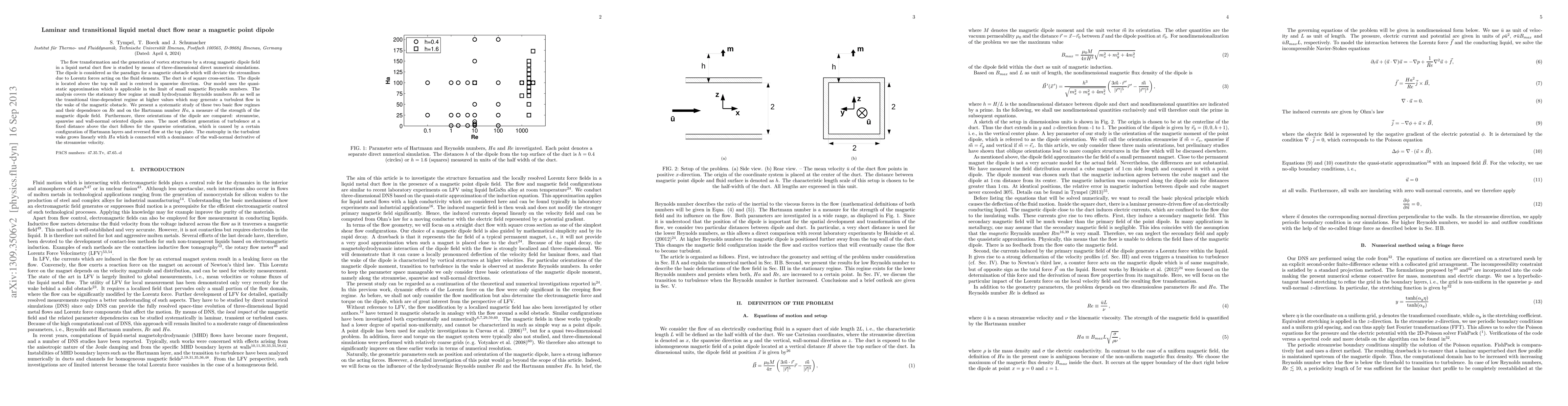 This study investigates the effects of a magnetic dipole field on liquid metal duct flow through three-dimensional simulations, focusing on both laminar and transitional regimes. The dipole orientation significantly influences turbulence generation, with the spanwise orientation proving most effective due to specific Hartmann layer configurations and reversed flow.