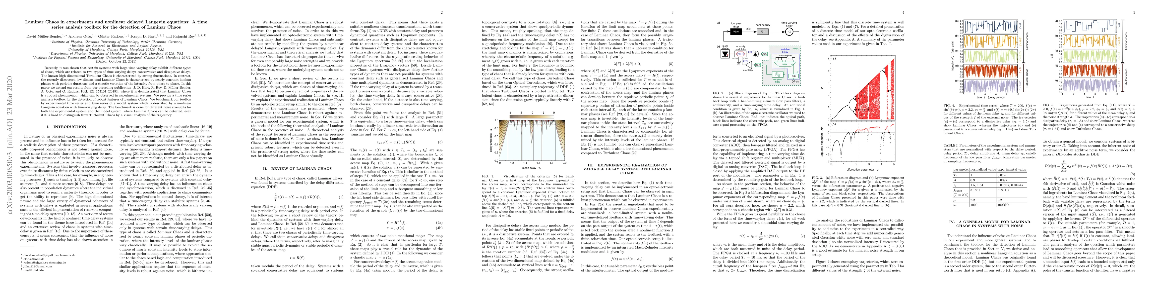Recently, it was shown that certain systems with large time-varying delay exhibit different types of chaos, which are related to two types of time-varying delay: conservative and dissipative delays. The known high-dimensional Turbulent Chaos is characterized by strong fluctuations. In contrast, the recently discovered low-dimensional Laminar Chaos is characterized by nearly constant laminar phases with periodic durations and a chaotic variation of the intensity from phase to phase. In this paper we extend our results from our preceding publication [J. D. Hart, R. Roy, D. M\"uller-Bender, A. Otto, and G. Radons, PRL 123 154101 (2019)], where it is demonstrated that Laminar Chaos is a robust phenomenon, which can be observed in experimental systems. We provide a time-series analysis toolbox for the detection of robust features of Laminar Chaos. We benchmark our toolbox by experimental time series and time series of a model system which is described by a nonlinear Langevin equation with time-varying delay. The benchmark is done for different noise strengths for both the experimental system and the model system, where Laminar Chaos can be detected, even if it is hard to distinguish from Turbulent Chaos by a visual analysis of the trajectory.