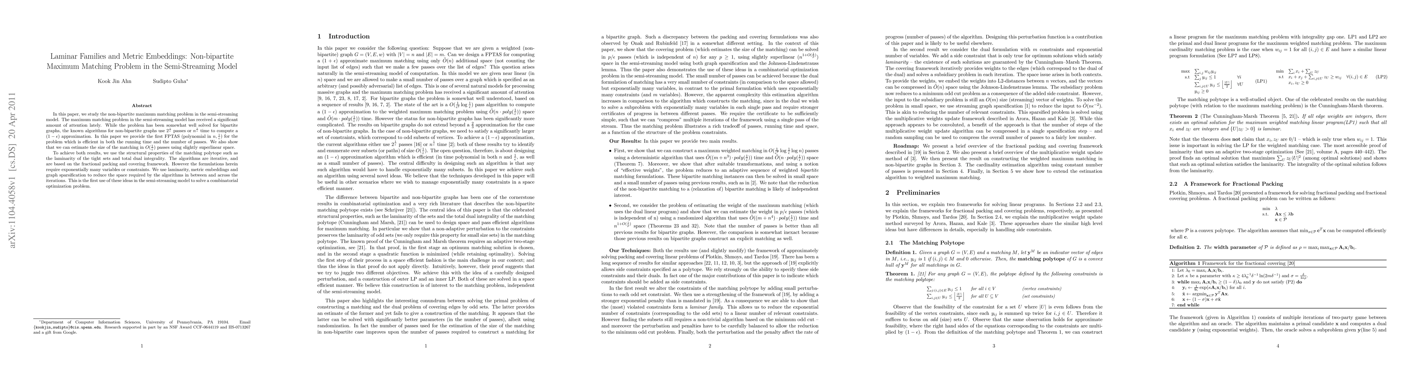In this paper, we study the non-bipartite maximum matching problem in the semi-streaming model. The maximum matching problem in the semi-streaming model has received a significant amount of attention lately. While the problem has been somewhat well solved for bipartite graphs, the known algorithms for non-bipartite graphs use $2^{\frac1\epsilon}$ passes or $n^{\frac1\epsilon}$ time to compute a $(1-\epsilon)$ approximation. In this paper we provide the first FPTAS (polynomial in $n,\frac1\epsilon$) for the problem which is efficient in both the running time and the number of passes. We also show that we can estimate the size of the matching in $O(\frac1\epsilon)$ passes using slightly superlinear space. To achieve both results, we use the structural properties of the matching polytope such as the laminarity of the tight sets and total dual integrality. The algorithms are iterative, and are based on the fractional packing and covering framework. However the formulations herein require exponentially many variables or constraints. We use laminarity, metric embeddings and graph sparsification to reduce the space required by the algorithms in between and across the iterations. This is the first use of these ideas in the semi-streaming model to solve a combinatorial optimization problem.