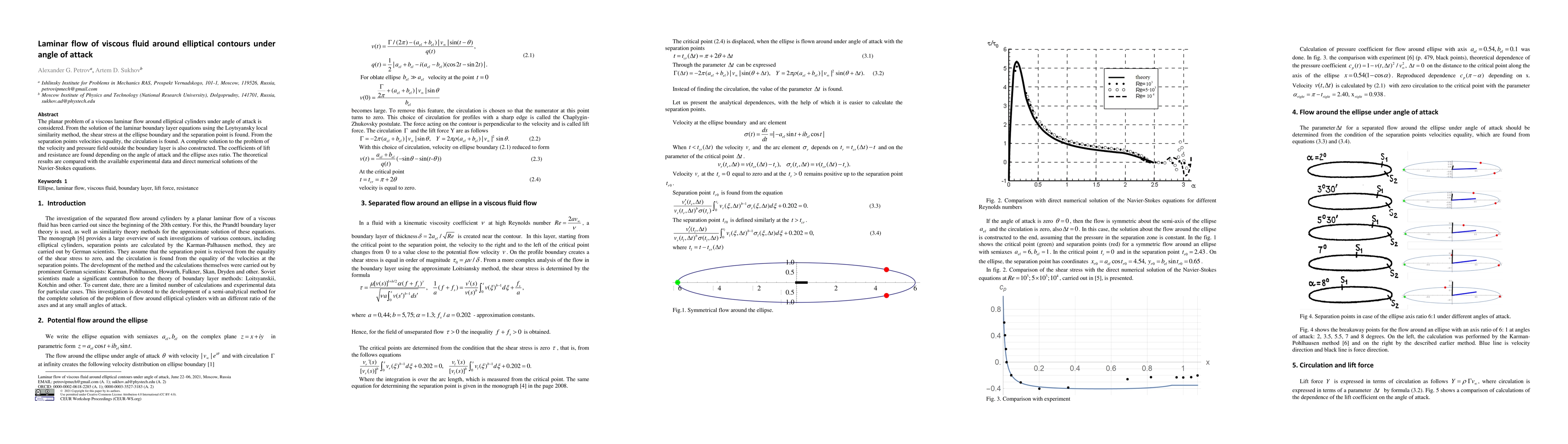 This study investigates laminar flow around elliptical cylinders at various angles of attack, solving the laminar boundary layer equations to determine shear stress and separation points. It derives lift and resistance coefficients and compares theoretical results with experimental and numerical data.