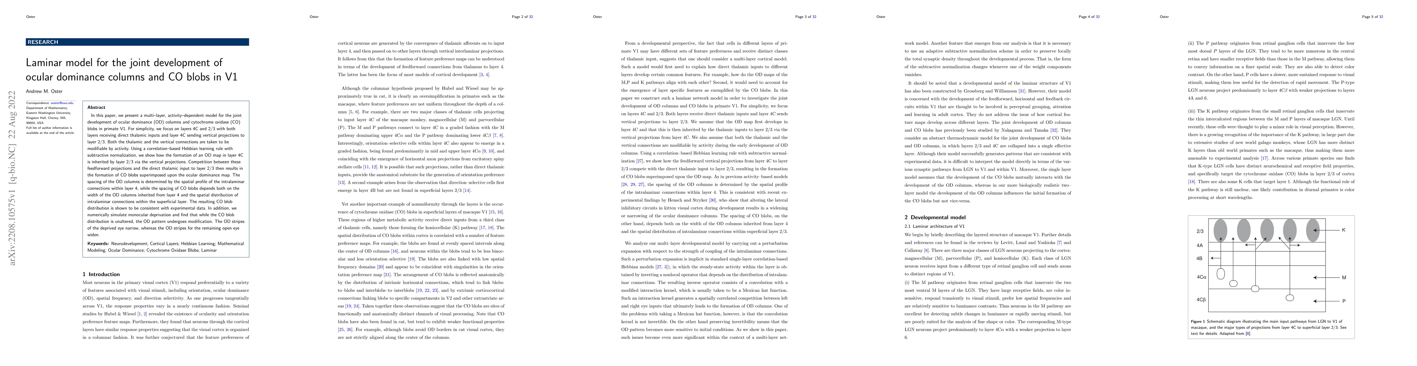 This paper proposes a multi-layer model for the development of ocular dominance columns and CO blobs in V1, showing how vertical projections from layer 4C to layer 2/3 influence CO blob formation. It demonstrates that CO blobs align with OD columns and are consistent with experimental data, while simulating effects of monocular deprivation.