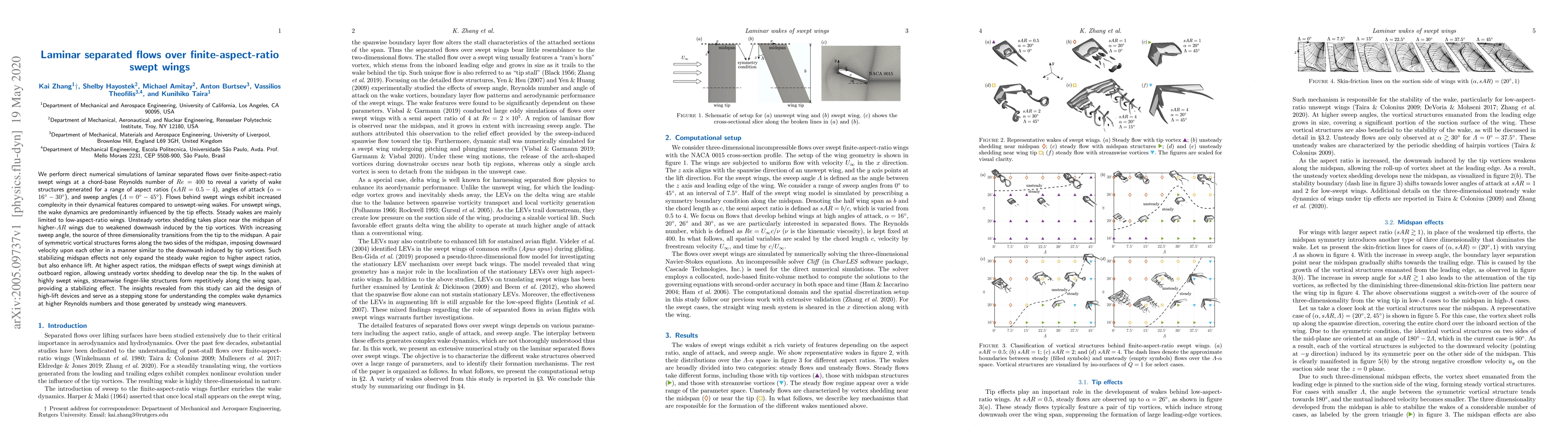 This study uses direct numerical simulations to analyze laminar separated flows over finite-aspect-ratio swept wings, revealing complex wake structures influenced by aspect ratios, angles of attack, and sweep angles. The midspan vortical structures stabilize the wake and enhance lift, while streamwise fingers stabilize the wake in highly swept wings.
