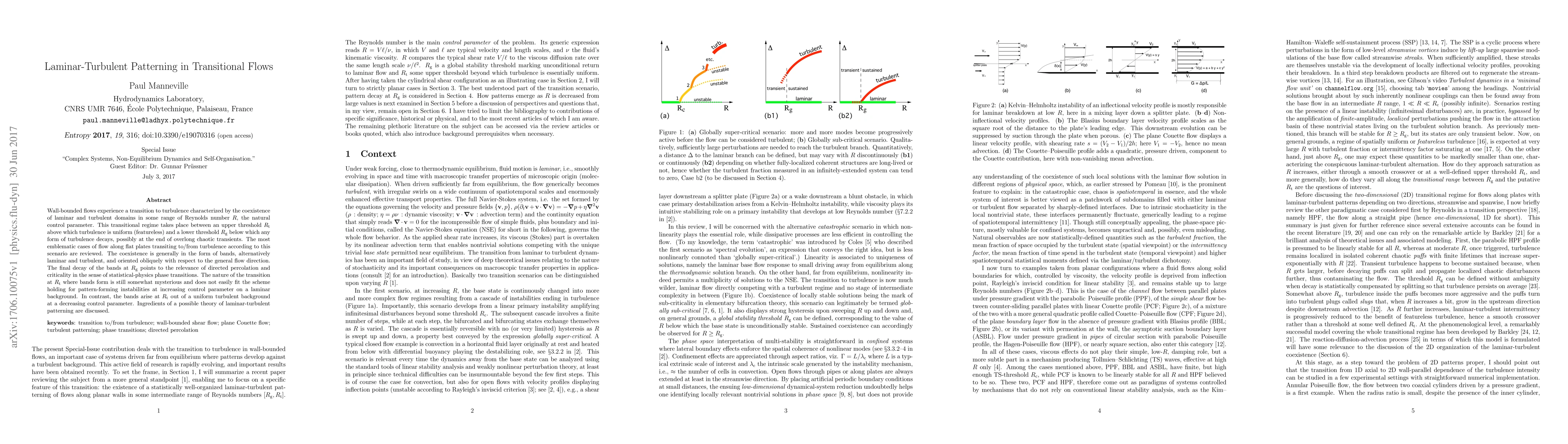 Wall-bounded flows experience a transition to turbulence characterized by the coexistence of laminar and turbulent domains in some range of Reynolds number R, the natural control parameter. This transitional regime takes place between an upper threshold Rt above which turbulence is uniform (featureless) and a lower threshold Rg below which any form of turbulence decays, possibly at the end of overlong chaotic transients. The most emblematic cases of flow along flat plates transiting to/from turbulence according to this scenario are reviewed. The coexistence is generally in the form of bands, alternatively laminar and turbulent, and oriented obliquely with respect to the general flow direction. The final decay of the bands at Rg points to the relevance of directed percolation and criticality in the sense of statistical-physics phase transitions. The nature of the transition at Rt where bands form is still somewhat mysterious and does not easily fit the scheme holding for pattern-forming instabilities at increasing control parameter on a laminar background. In contrast, the bands arise at Rt out of a uniform turbulent background at a decreasing control parameter. Ingredients of a possible theory of laminar-turbulent patterning are discussed.