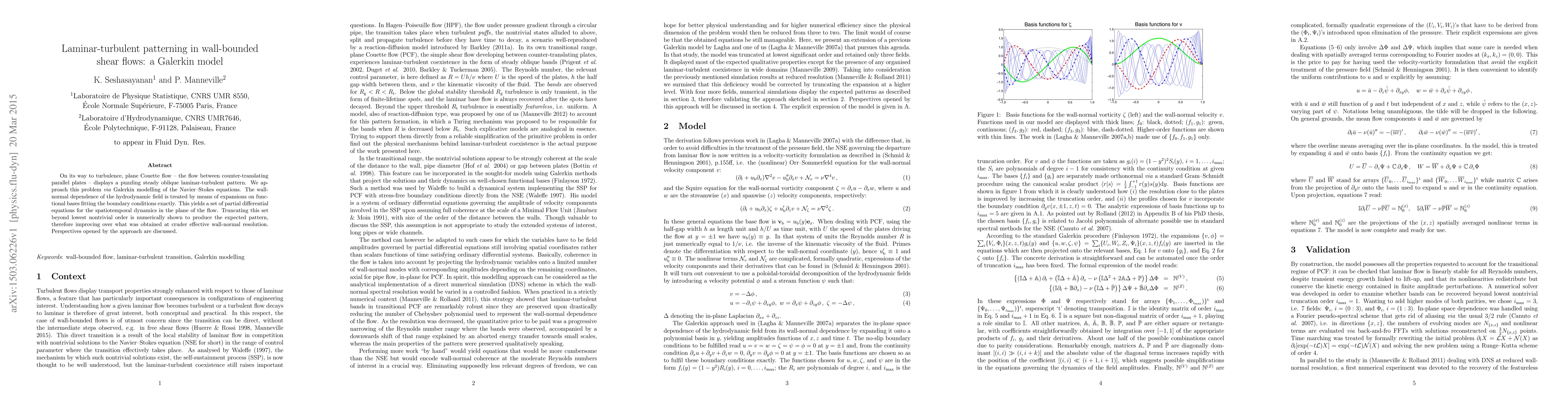 Researchers developed a Galerkin model to study laminar-turbulent patterns in wall-bounded shear flows, such as plane Couette flow, and found that truncating the equations beyond the lowest nontrivial order produces the expected pattern.