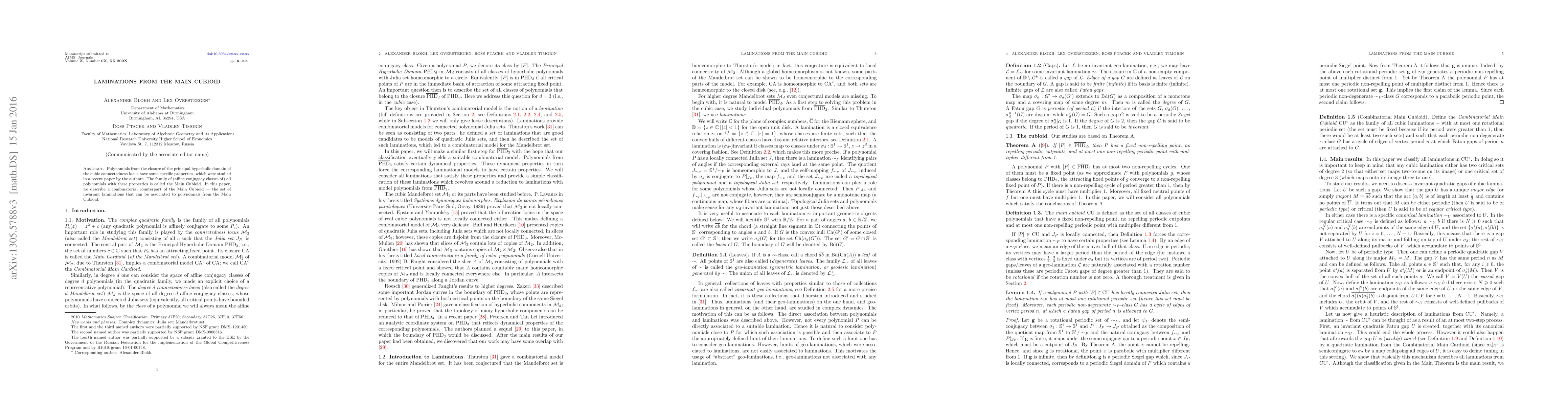 According to a recent paper \cite{bopt13}, polynomials from the closure $\bar{\rm PHD}_3$ of the {\em Principal Hyperbolic Domain} ${\rm PHD}_3$ of the cubic connectedness locus have a few specific properties. The family $\mathrm{CU}$ of all polynomials with these properties is called the \emph{Main Cubioid}. In this paper we describe the set $\mathrm{CU}^c$ of laminations which can be associated to polynomials from $\mathrm{CU}$.