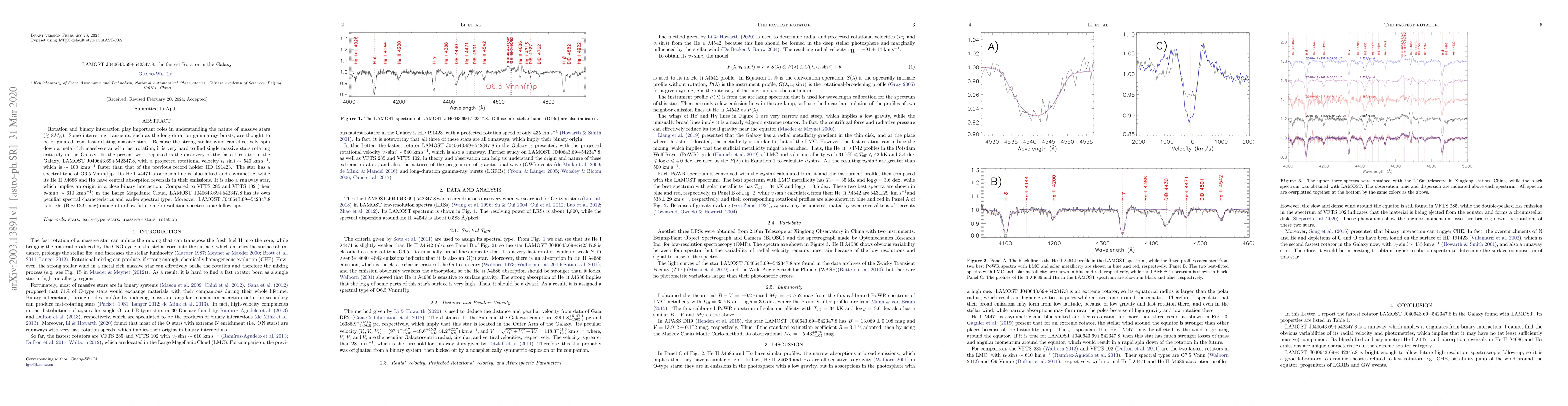 Rotation and binary interaction play important roles in understanding the nature of massive stars (>8 Msun). Some interesting transients, such as the long-duration gamma-ray bursts, are thought to be originated from fast-rotating massive stars. Because the strong stellar wind can effectively spin down a metal-rich massive star with fast rotation, it is very hard to find single massive stars rotating critically in the Galaxy. In the present work reported is the discovery of the fastest rotator in the Galaxy, LAMOST J040643.69+542347.8, with a projected rotational velocity vsini ~540 km/s, which is ~ 100 km/s faster than that of the previous record holder HD 191423. The star has a spectral type of O6.5 Vnnn(f)p. Its He I 4471 absorption line is blueshifted and asymmetric, while its He II 4686 and Ha have central absorption reversals in their emissions. It is also a runaway star, which implies an origin in a close binary interaction. Compared to VFTS 285 and VFTS 102 (their vsini ~ 610 km/s) in the Large Magellanic Cloud, LAMOST J040643.69+542347.8 has its own peculiar spectral characteristics and earlier spectral type. Moreover, LAMOST J040643.69+542347.8 is bright (B ~ 13.9 mag) enough to allow future high-resolution spectroscopic follow-ups.