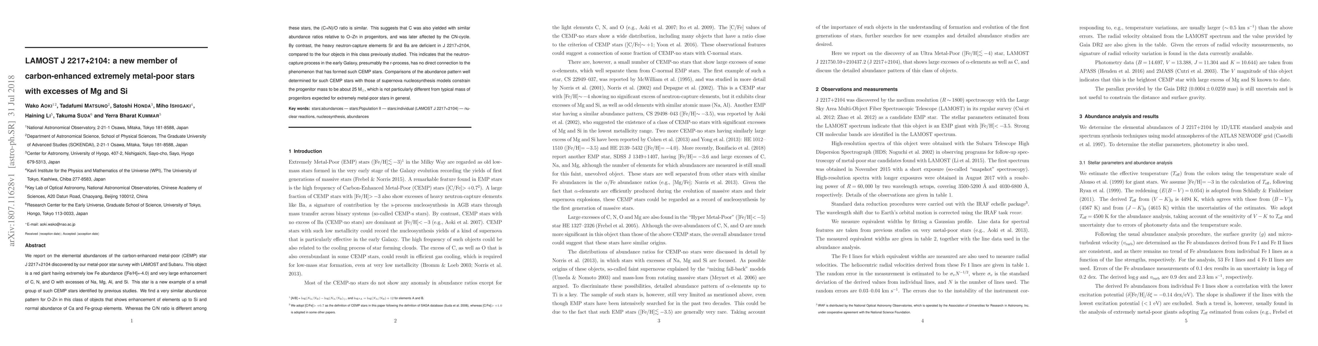 We report on the elemental abundances of the carbon-enhanced metal-poor (CEMP) star J2217+2104 discovered by our metal-poor star survey with LAMOST and Subaru. This object is a red giant having extremely low Fe abundance ([Fe/H]=-4.0) and very large enhancement of C, N, and O with excesses of Na, Mg, Al, and Si. This star is a new example of a small group of such CEMP stars identified by previous studies. We find a very similar abundance pattern for O-Zn in this class of objects that shows enhancement of elements up to Si and normal abundance of Ca and Fe-group elements. Whereas the C/N ratio is different among these stars, the (C+N)/O ratio is similar. This suggests that C was also yielded with similar abundance ratios relative to O-Zn in progenitors, and was later affected by the CN-cycle. By contrast, the heavy neutron-capture elements Sr and Ba are deficient in J2217+2104, compared to the four objects in this class previously studied. This indicates that the neutron-capture process in the early Galaxy, presumably the r-process, has no direct connection to the phenomenon that has formed such CEMP stars. Comparisons of the abundance pattern well determined for such CEMP stars with those of supernova nucleosynthesis models constrain the progenitor mass to be about 25Msun, which is not particularly different from typical mass of progenitors expected for extremely metal-poor stars in general.