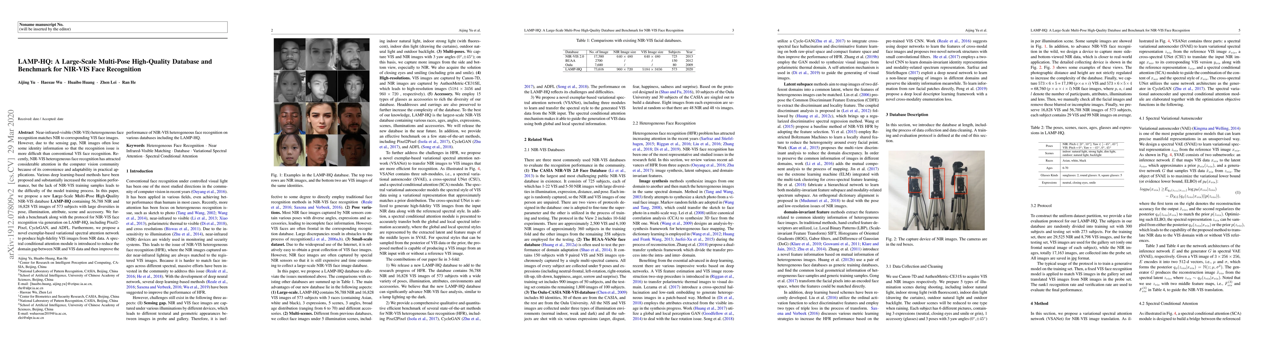This paper introduces LAMP-HQ, a large-scale multi-pose high-quality NIR-VIS face recognition database with 56,788 NIR and 16,828 VIS images, aiming to improve NIR-VIS heterogeneous face recognition. It also proposes a novel exemplar-based variational spectral attention network to enhance recognition performance by reducing the domain gap between NIR and VIS data.