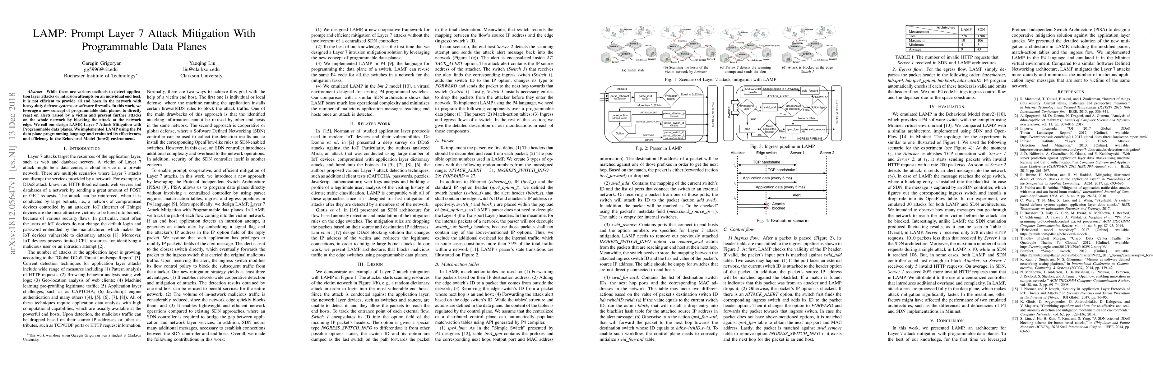 LAMP is a novel approach for mitigating Layer 7 attacks using programmable data planes to block threats at the network edge, rather than relying on individual end hosts. Implemented with P4, it was evaluated in the bmv2 environment for effectiveness and efficiency.