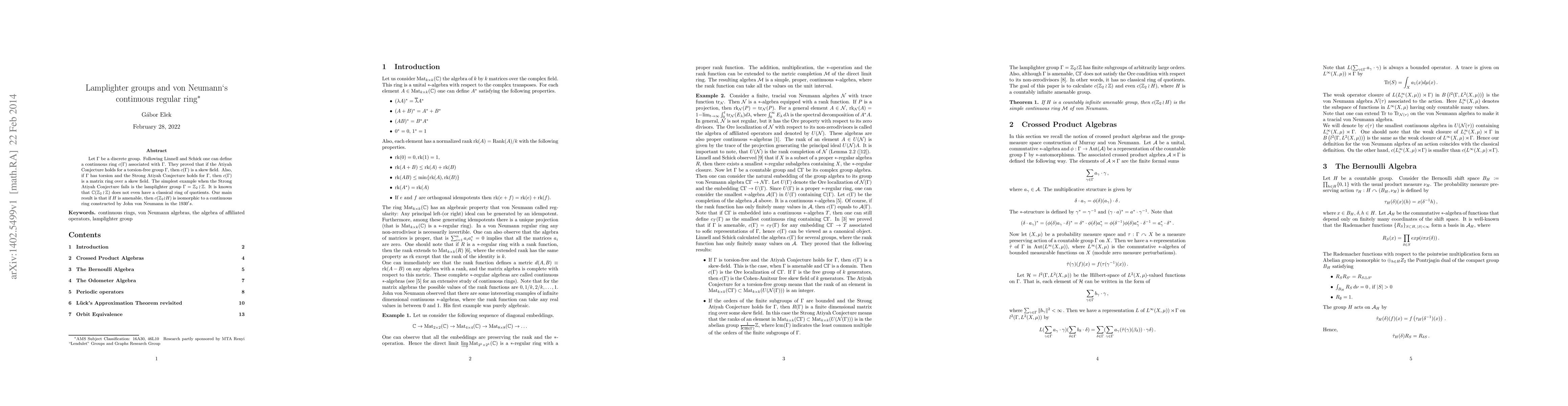 Let $\Gamma$ be a discrete group. Following Linnell and Schick one can define a continuous ring $c(\Gamma)$ associated with $\Gamma$. They proved that if the Atiyah Conjecture holds for a torsion-free group $\Gamma$, then $c(\Gamma)$ is a skew field. Also, if $\Gamma$ has torsion and the Strong Atiyah Conjecture holds for $\Gamma$, then $c(\Gamma)$ is a matrix ring over a skew field. The simplest example when the Strong Atiyah Conjecture fails is the lamplighter group $\Gamma=Z_2\wr Z$. It is known that $C(Z_2\wr Z)$ does not even have a classical ring of quotients. Our main result is that if $H$ is amenable, then $c(Z_2\wr H)$ is isomorphic to a continuous ring constructed by John von Neumann in the $1930's$.