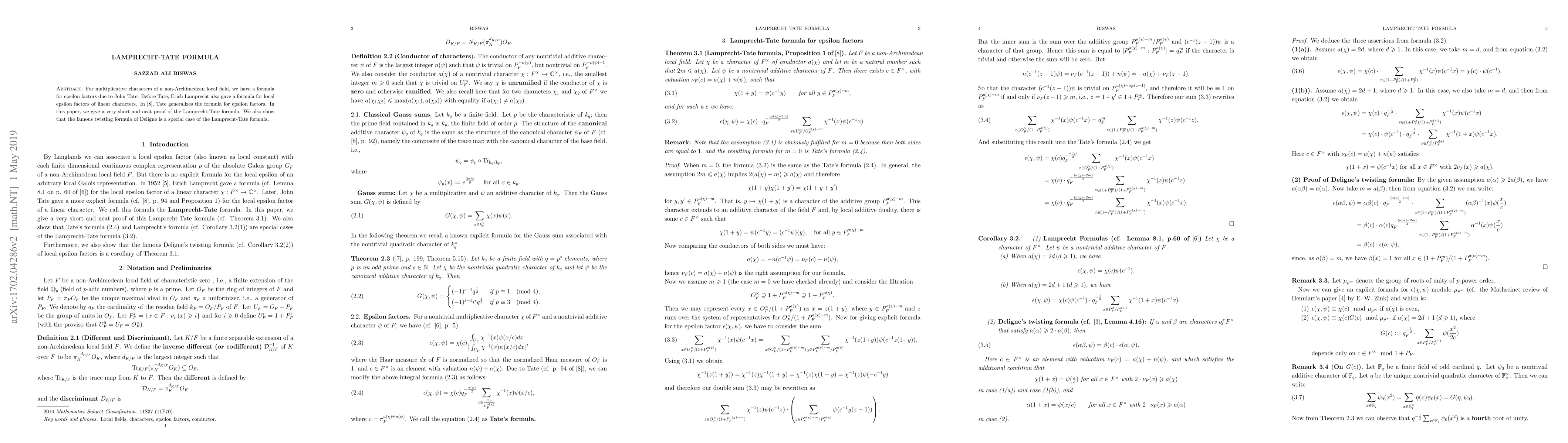 This paper provides a concise proof of the Lamprecht-Tate formula for epsilon factors in non-Archimedean local fields, demonstrating that Deligne's twisting formula is a special case of it. The work builds on previous contributions by Erich Lamprecht and John Tate.