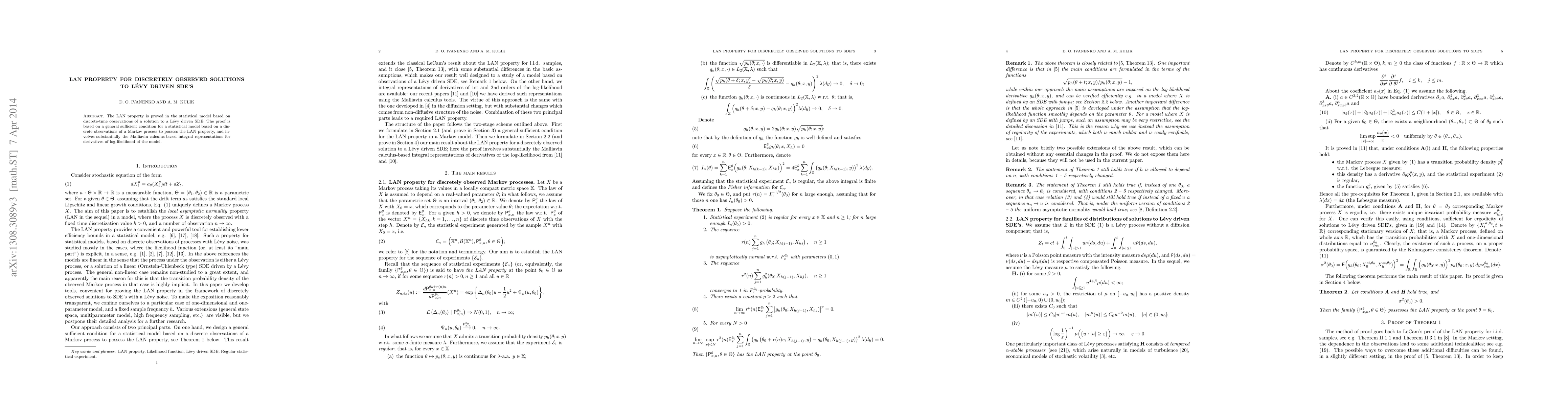 This paper proves the Law of Large Numbers (LAN) property for a statistical model based on discrete-time observations of solutions to Levy driven stochastic differential equations (SDEs), utilizing Malliavin calculus-based integral representations.
