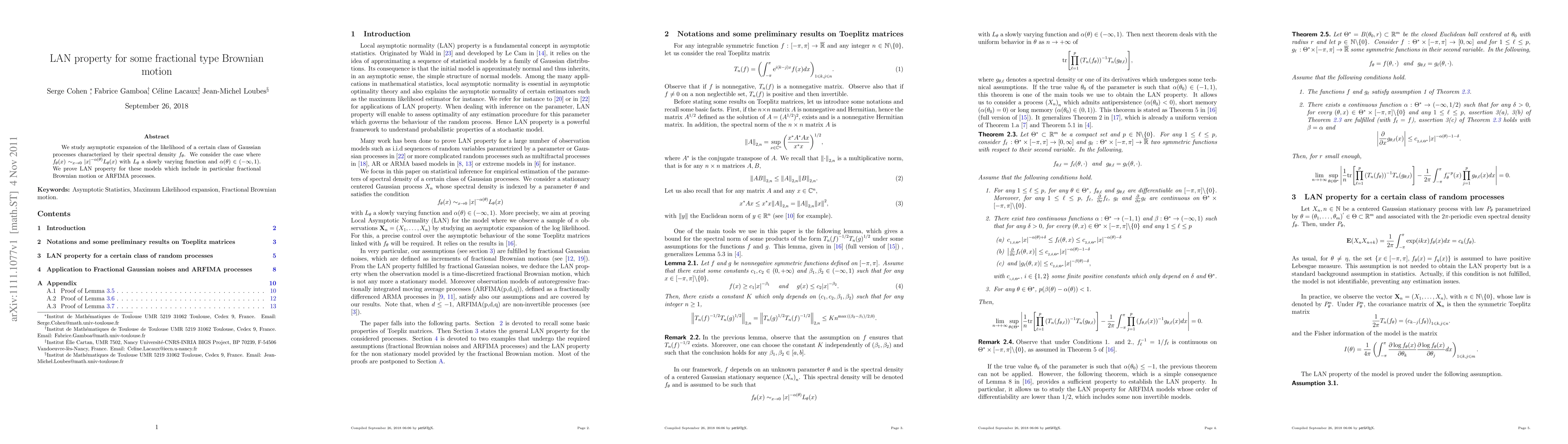 We study asymptotic expansion of the likelihood of a certain class of Gaussian processes characterized by their spectral density $f_\theta$. We consider the case where $f_\theta\PAR{x} \sim_{x\to 0} \ABS{x}^{-\al(\theta)}L_\theta(x)$ with $L_\theta$ a slowly varying function and $\al\PAR{\theta}\in (-\infty,1)$. We prove LAN property for these models which include in particular fractional Brownian motion %$B^\alpha_t,\: \alpha \geq 1/2$ or ARFIMA processes.