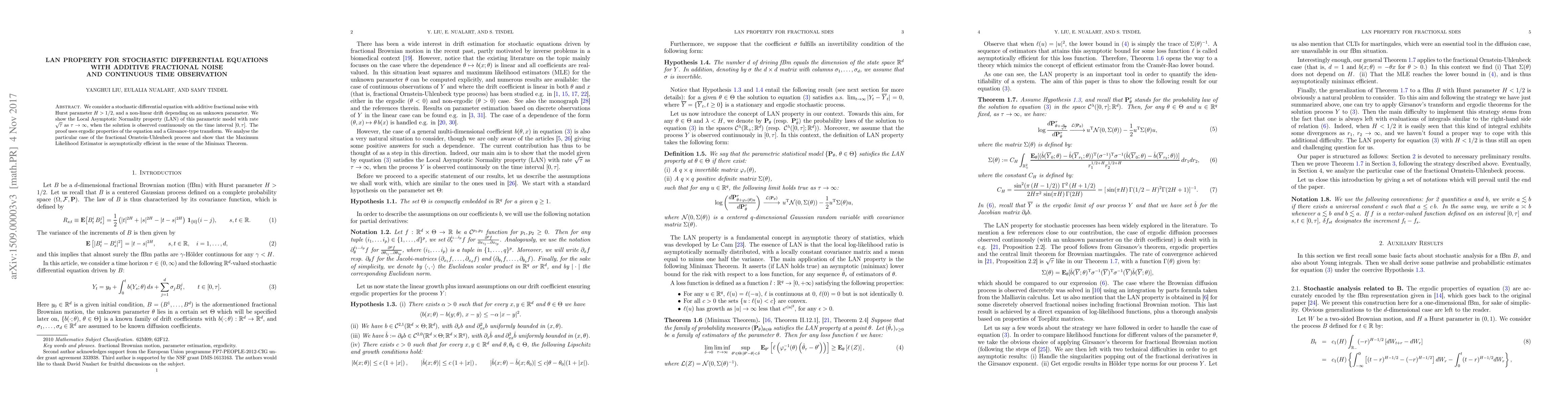 This paper demonstrates the Local Asymptotic Normality (LAN) property for stochastic differential equations with additive fractional noise and continuous observation, showing efficiency of the Maximum Likelihood Estimator for the fractional Ornstein-Uhlenbeck process via ergodic properties and a Girsanov-type transform.