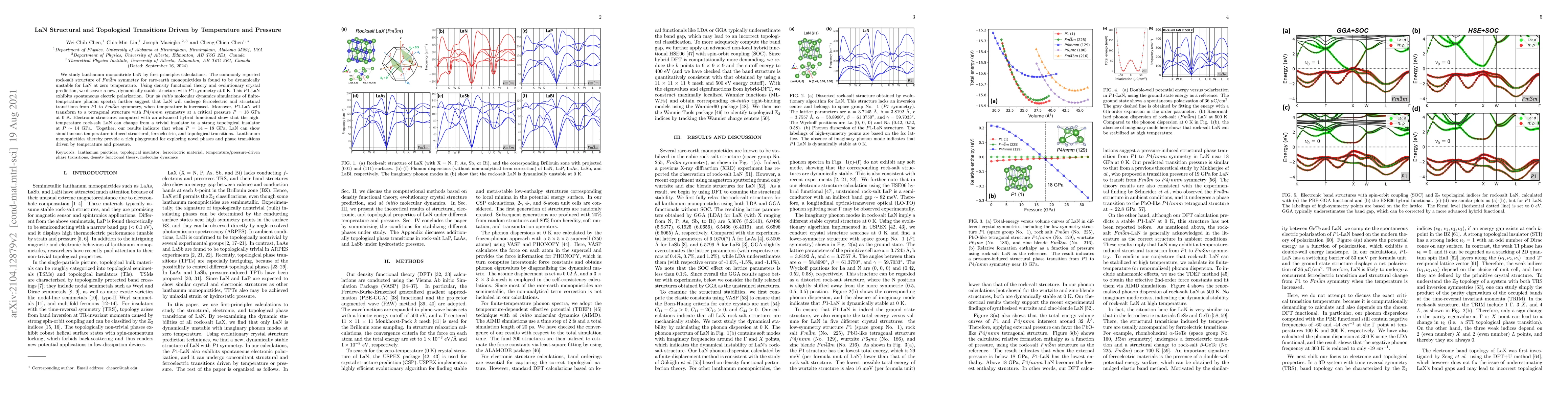 We study lanthanum mononitride LaN by first-principles calculations. The commonly reported rock-salt structure of $Fm\bar{3}m$ symmetry for rare-earth monopnictides is found dynamically unstable for LaN at zero temperature. Using density functional theory and evolutionary crystal prediction, we discover a new, dynamically stable structure with $P1$ symmetry at 0 K. This $P1$-LaN exhibits spontaneous electric polarization. Our ab initio molecular dynamics simulations of finite-temperature phonon spectra further suggest that LaN will undergo ferroelectric and structural transitions from $P1$ to $Fm\bar{3}m$ symmetry, when temperature is increased. Moreover, $P1$-LaN will transform to a tetragonal structure with $P4/nmm$ symmetry at a critical pressure $P=18$ GPa at 0 K. Electronic structures computed with an advanced hybrid functional show that the high-temperature rock-salt LaN can change from a trivial insulator to a strong topological insulator at $P \sim 14$ GPa. Together, our results indicate that when $P=14 - 18$ GPa, LaN can show simultaneous temperature-induced structural, ferroelectric, and topological transitions. Lanthanum monopnictides thereby provide a rich playground for exploring novel phases and phase transitions driven by temperature and pressure.