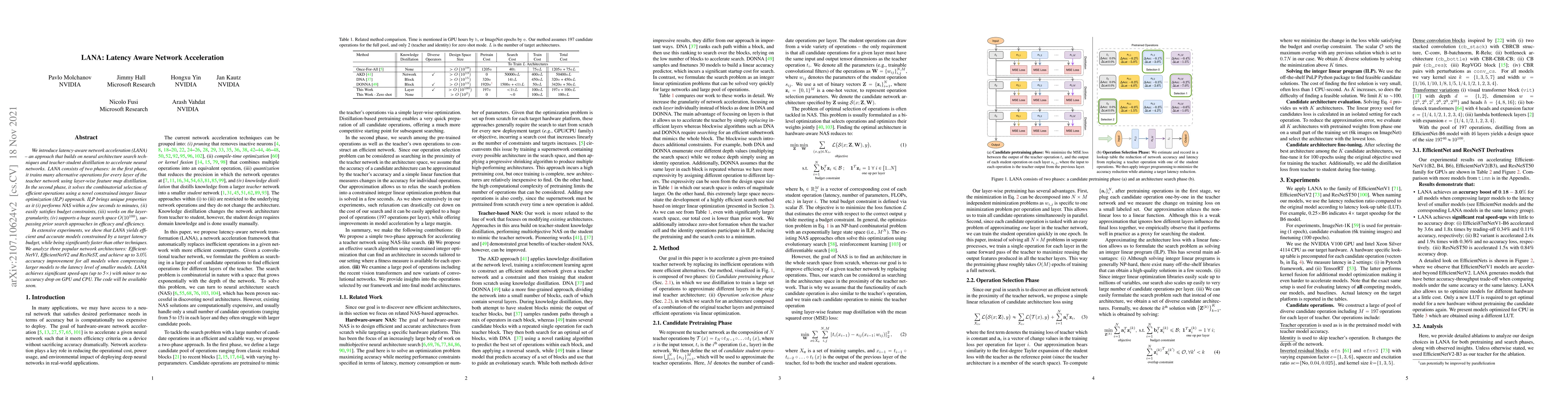 We introduce latency-aware network acceleration (LANA) - an approach that builds on neural architecture search techniques and teacher-student distillation to accelerate neural networks. LANA consists of two phases: in the first phase, it trains many alternative operations for every layer of the teacher network using layer-wise feature map distillation. In the second phase, it solves the combinatorial selection of efficient operations using a novel constrained integer linear optimization (ILP) approach. ILP brings unique properties as it (i) performs NAS within a few seconds to minutes, (ii) easily satisfies budget constraints, (iii) works on the layer-granularity, (iv) supports a huge search space $O(10^{100})$, surpassing prior search approaches in efficacy and efficiency. In extensive experiments, we show that LANA yields efficient and accurate models constrained by a target latency budget, while being significantly faster than other techniques. We analyze three popular network architectures: EfficientNetV1, EfficientNetV2 and ResNeST, and achieve accuracy improvement for all models (up to $3.0\%$) when compressing larger models to the latency level of smaller models. LANA achieves significant speed-ups (up to $5\times$) with minor to no accuracy drop on GPU and CPU. The code will be shared soon.