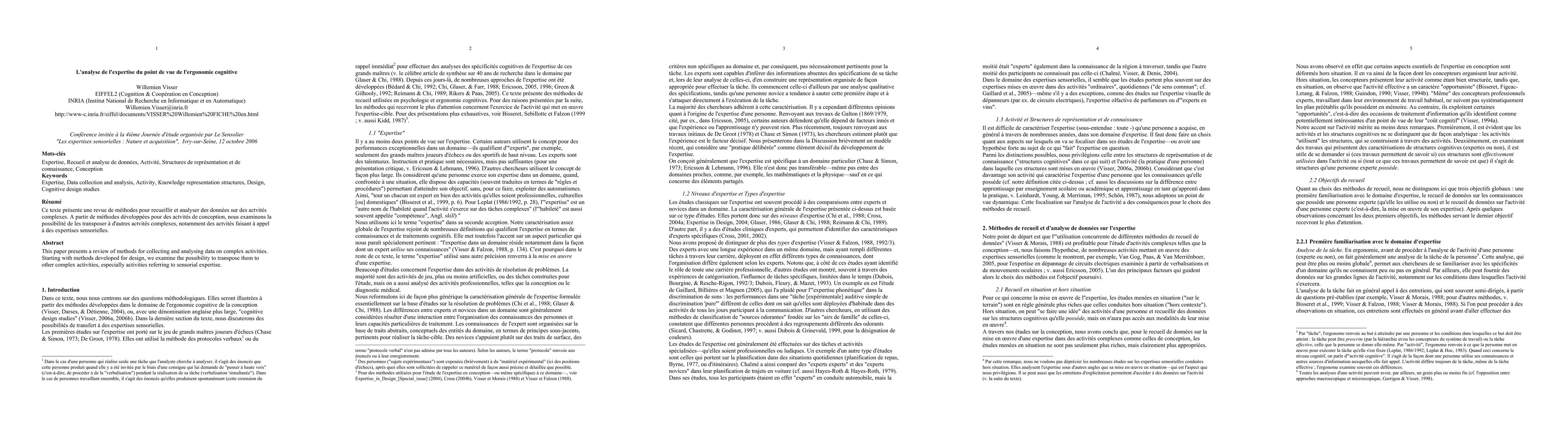 This paper presents a review of methods for collecting and analysing data on complex activities. Starting with methods developed for design, we examine the possibility to transpose them to other complex activities, especially activities referring to sensorial expertise. R\'esum\'e Ce texte pr\'esente une revue de m\'ethodes pour recueillir et analyser des donn\'ees sur des actvit\'es complexes. A partir de m\'ethodes d\'evelopp\'ees pour des actvit\'es de conception, nous examinons la possibilit\'e de les transposer \`a d'autres actvit\'es complexes, notamment des actvit\'es faisant \`a appel \`a des expertises sensorielles.