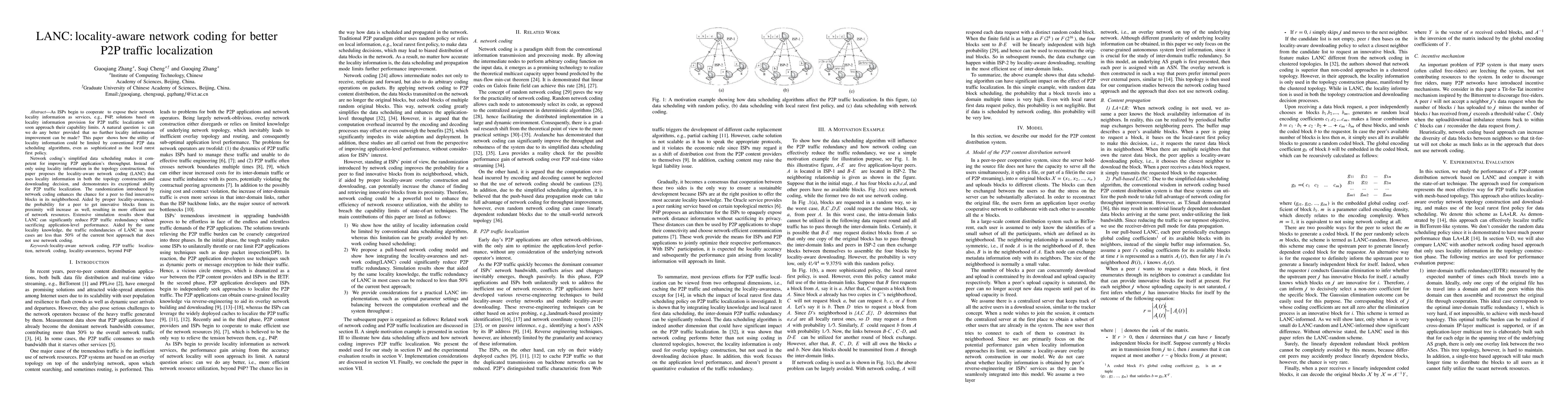 This paper proposes locality-aware network coding (LANC) to enhance P2P traffic localization by leveraging both topology construction and downloading decisions based on network locality information. LANC significantly reduces P2P traffic redundancy, achieving less than 50% of the redundancies of the best non-network coding approaches.