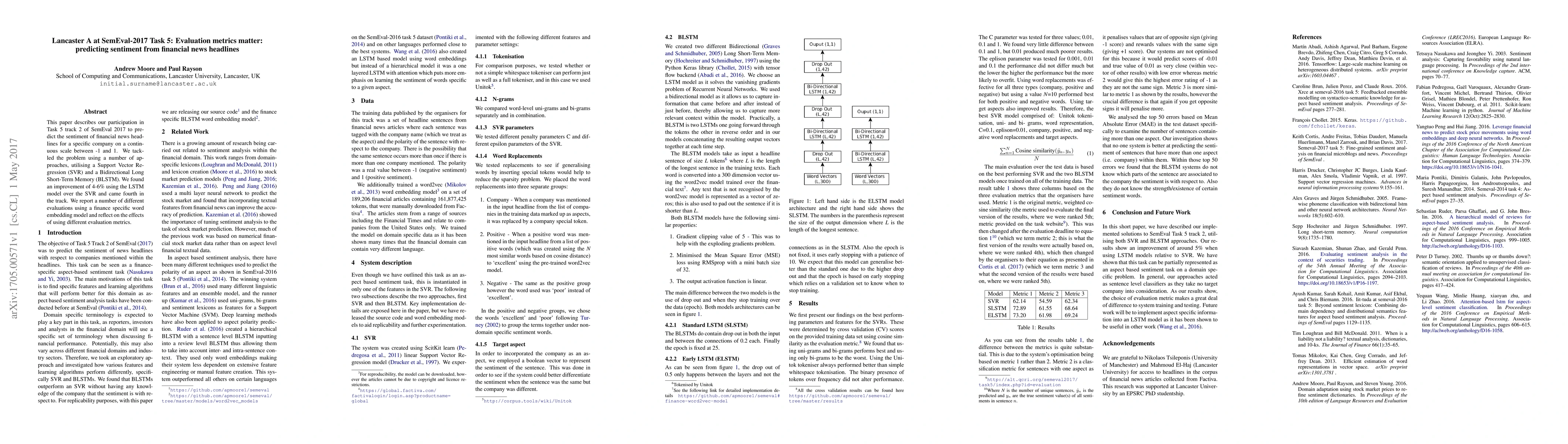 This paper details Lancaster A's participation in SemEval 2017 Task 5, predicting financial news sentiment using SVR and BLSTM. The BLSTM model outperformed SVR by 4-6%, leading to a fourth-place finish, and highlights the impact of different evaluation metrics.