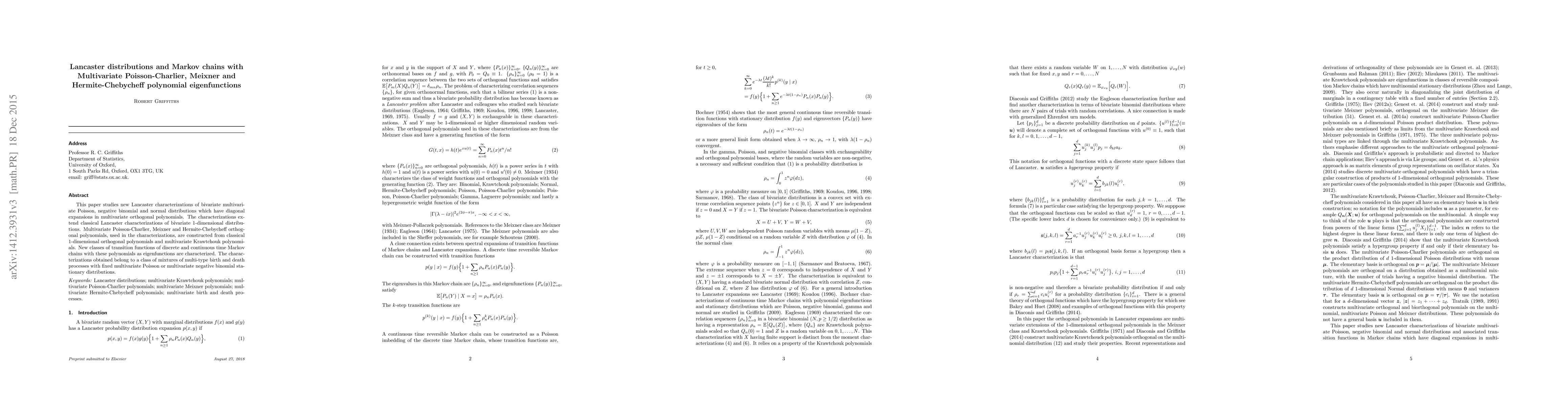 This paper introduces Lancaster characterizations for multivariate Poisson, negative binomial, and normal distributions using multivariate orthogonal polynomials. It also characterizes new Markov chains with these polynomials as eigenfunctions, linking them to mixtures of multi-type birth and death processes.