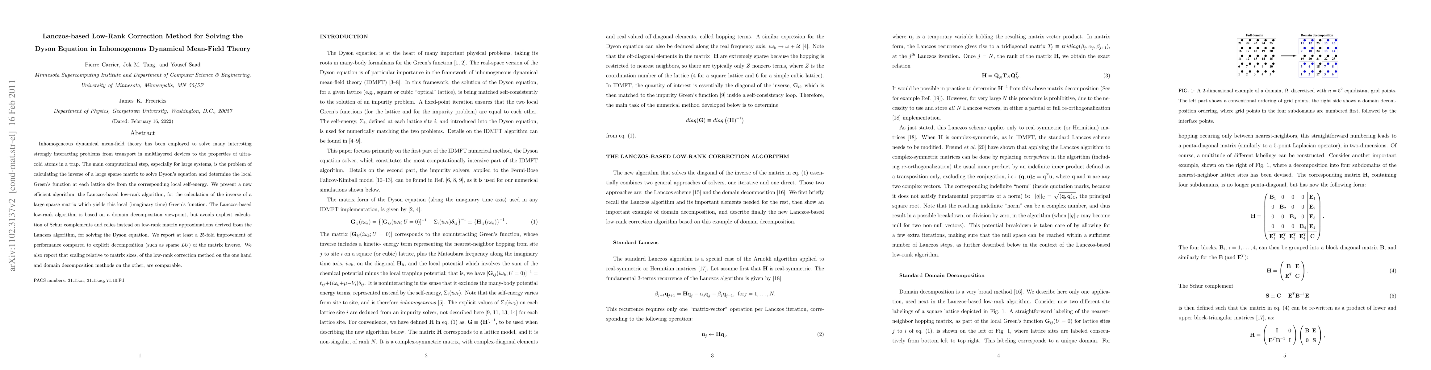 Inhomogeneous dynamical mean-field theory has been employed to solve many interesting strongly interacting problems from transport in multilayered devices to the properties of ultracold atoms in a trap. The main computational step, especially for large systems, is the problem of calculating the inverse of a large sparse matrix to solve Dyson's equation and determine the local Green's function at each lattice site from the corresponding local self-energy. We present a new efficient algorithm, the Lanczos-based low-rank algorithm, for the calculation of the inverse of a large sparse matrix which yields this local (imaginary time) Green's function. The Lanczos-based low-rank algorithm is based on a domain decomposition viewpoint, but avoids explicit calculation of Schur complements and relies instead on low-rank matrix approximations derived from the Lanczos algorithm, for solving the Dyson equation. We report at least a 25-fold improvement of performance compared to explicit decomposition (such as sparse LU) of the matrix inverse. We also report that scaling relative to matrix sizes, of the low-rank correction method on the one hand and domain decomposition methods on the other, are comparable.