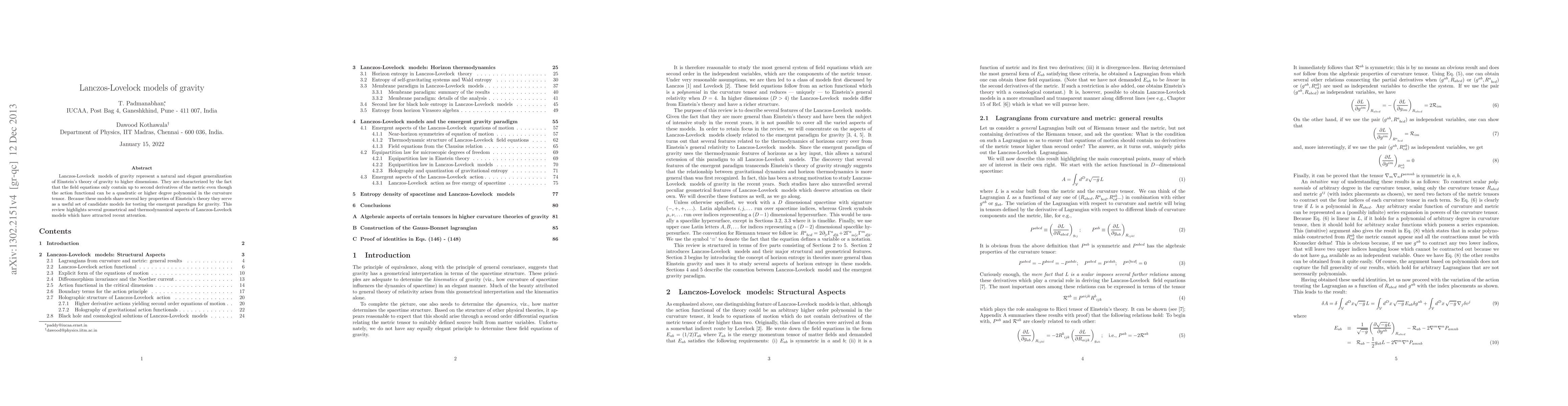 This paper reviews Lanczos-Lovelock models of gravity, a generalization of Einstein's theory that maintains second-order field equations despite higher-degree curvature terms. It emphasizes their geometrical and thermodynamical properties, making them valuable for testing gravity theories.