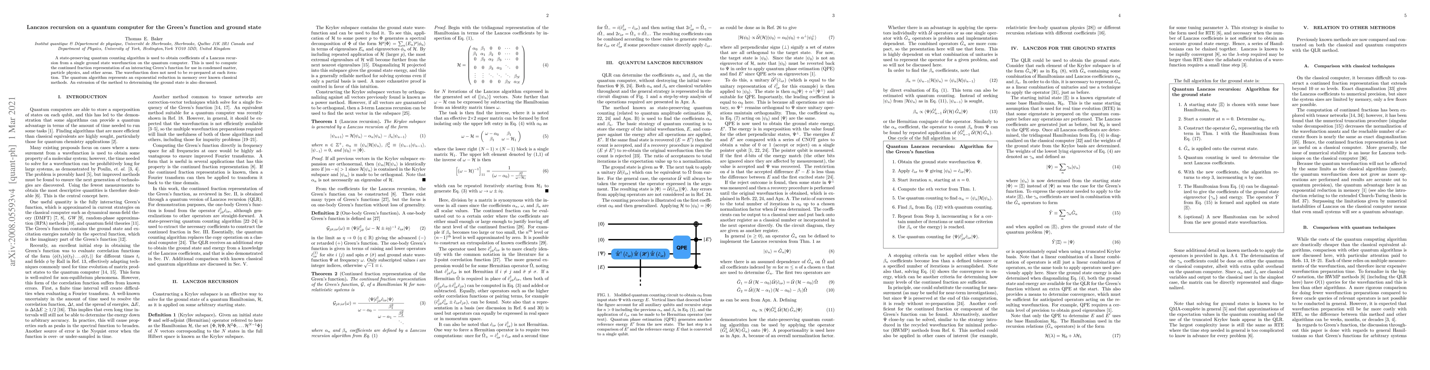 A state-preserving quantum counting algorithm is used to obtain coefficients of a Lanczos recursion from a single ground state wavefunction on the quantum computer. This is used to compute the continued fraction representation of an interacting Green's function for use in condensed matter, particle physics, and other areas. The wavefunction does not need to be re-prepared at each iteration. The quantum algorithm represents an exponential reduction in memory over known classical methods. An extension of the method to determining the ground state is also discussed.