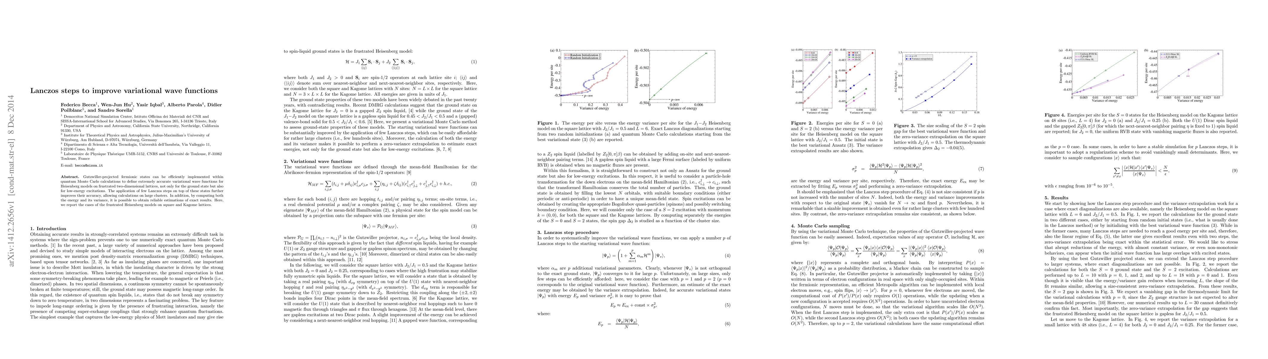 Gutzwiller-projected fermionic states can be efficiently implemented within quantum Monte Carlo calculations to define extremely accurate variational wave functions for Heisenberg models on frustrated two-dimensional lattices, not only for the ground state but also for low-energy excitations. The application of few Lanczos steps on top of these states further improves their accuracy, allowing calculations on large clusters. In addition, by computing both the energy and its variance, it is possible to obtain reliable estimations of exact results. Here, we report the cases of the frustrated Heisenberg models on square and Kagome lattices.
