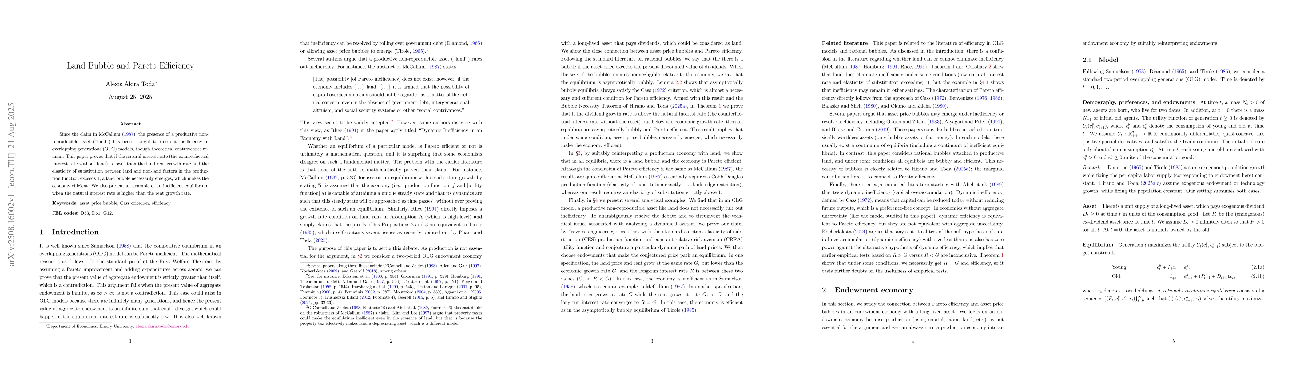 Since McCallum (1987), the presence of a productive non-reproducible asset ("land") has been thought to rule out inefficiency in overlapping generations (OLG) models, though theoretical controversies remain. This paper proves that if the natural interest rate (the counterfactual interest rate without land) is lower than the land rent growth rate and the elasticity of substitution between land and non-land factors in the production function exceeds 1, a land bubble necessarily emerges, which makes the economy efficient. We also present an example of an inefficient equilibrium when the natural interest rate is higher than the rent growth rate.