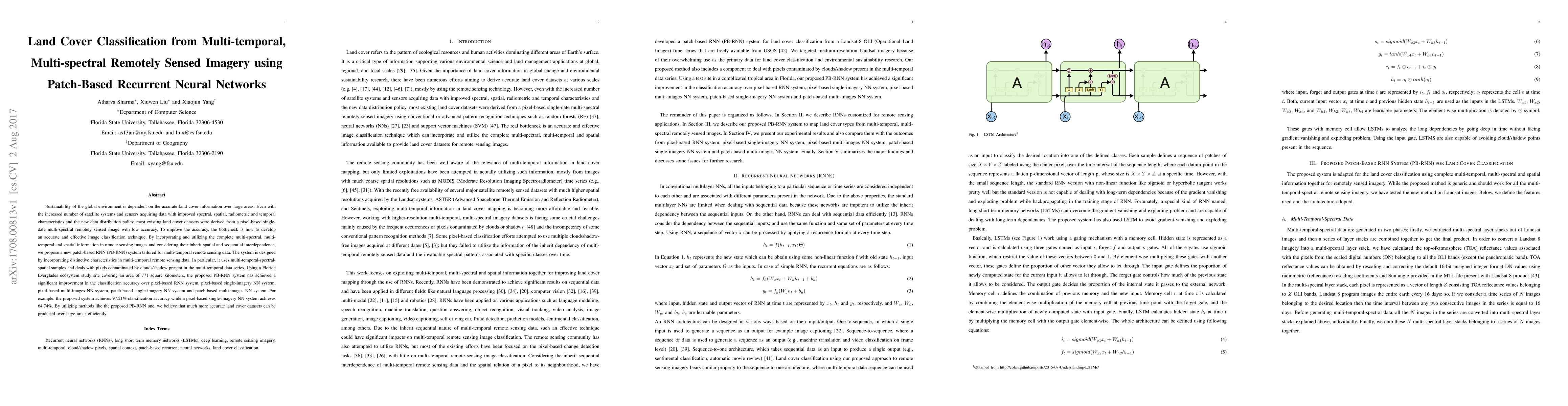 Sustainability of the global environment is dependent on the accurate land cover information over large areas. Even with the increased number of satellite systems and sensors acquiring data with improved spectral, spatial, radiometric and temporal characteristics and the new data distribution policy, most existing land cover datasets were derived from a pixel-based single-date multi-spectral remotely sensed image with low accuracy. To improve the accuracy, the bottleneck is how to develop an accurate and effective image classification technique. By incorporating and utilizing the complete multi-spectral, multi-temporal and spatial information in remote sensing images and considering their inherit spatial and sequential interdependence, we propose a new patch-based RNN (PB-RNN) system tailored for multi-temporal remote sensing data. The system is designed by incorporating distinctive characteristics in multi-temporal remote sensing data. In particular, it uses multi-temporal-spectral-spatial samples and deals with pixels contaminated by clouds/shadow present in the multi-temporal data series. Using a Florida Everglades ecosystem study site covering an area of 771 square kilo-meters, the proposed PB-RNN system has achieved a significant improvement in the classification accuracy over pixel-based RNN system, pixel-based single-imagery NN system, pixel-based multi-images NN system, patch-based single-imagery NN system and patch-based multi-images NN system. For example, the proposed system achieves 97.21% classification accuracy while a pixel-based single-imagery NN system achieves 64.74%. By utilizing methods like the proposed PB-RNN one, we believe that much more accurate land cover datasets can be produced over large areas efficiently.