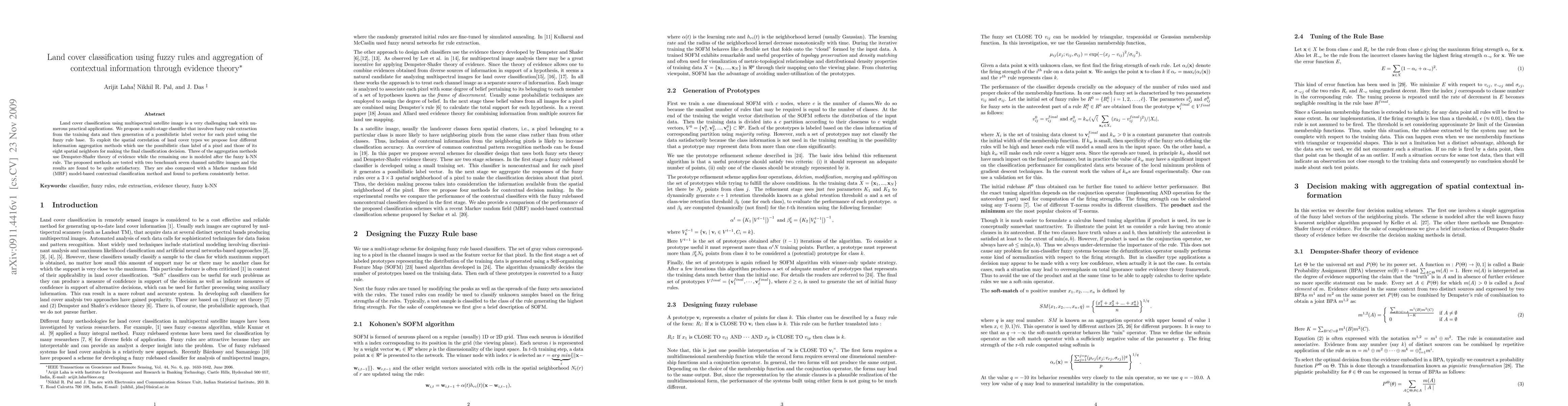 This paper proposes a multi-stage classifier for land cover classification using multispectral satellite images, combining fuzzy rules with evidence theory for spatial correlation. The method outperforms a Markov random field model in classification accuracy on benchmark satellite images.