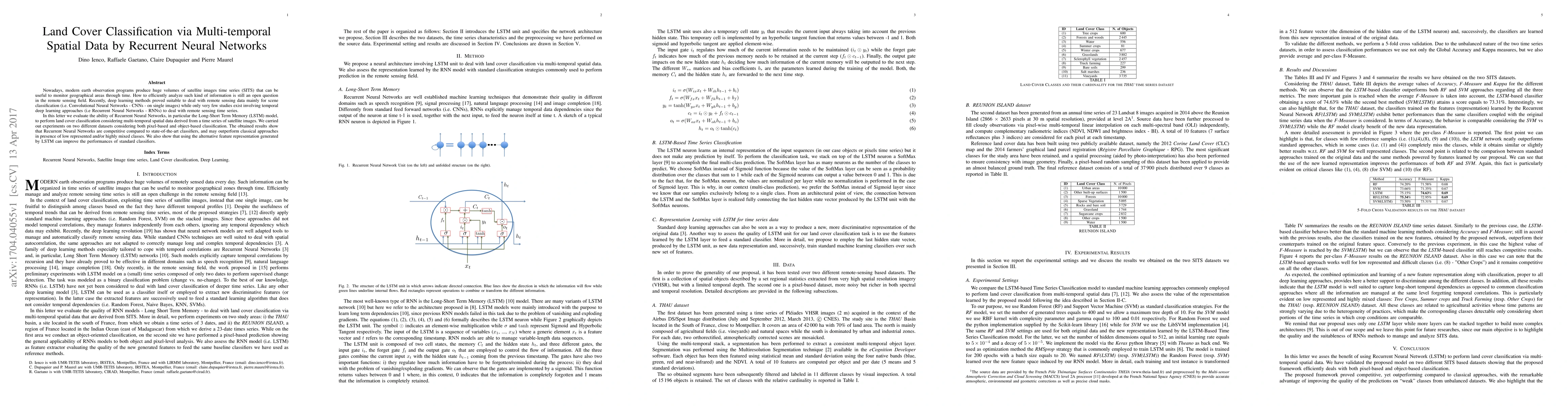 This paper evaluates the use of Long-Short Term Memory (LSTM) Recurrent Neural Networks for land cover classification using multi-temporal spatial data from satellite image time series. The results indicate that LSTMs are competitive with state-of-the-art classifiers and can outperform traditional methods, especially for underrepresented or mixed classes.