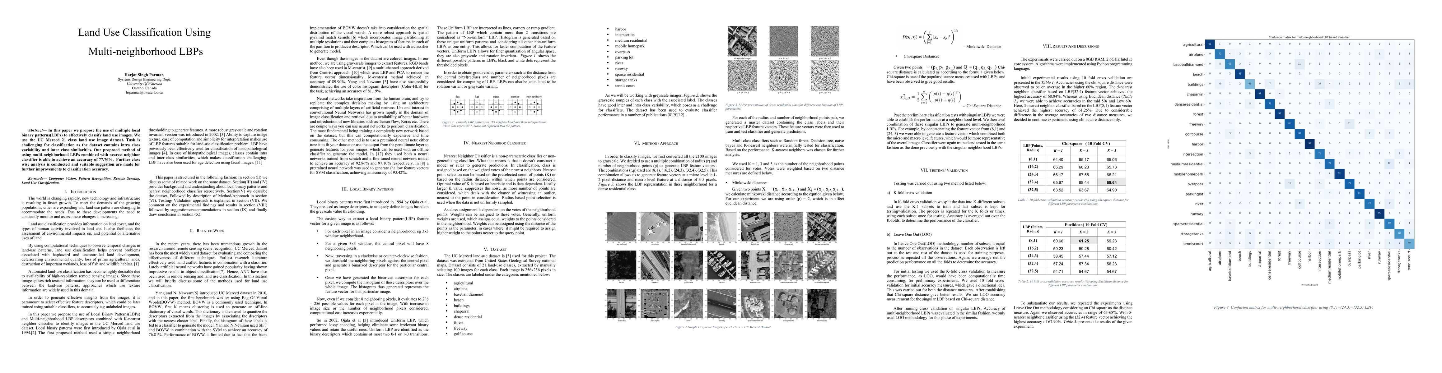 Researchers used multiple local binary patterns (LBPs) to classify land use images with an accuracy of 77.76% on the UC Merced 21 class dataset, suggesting improvements for further classification accuracy.