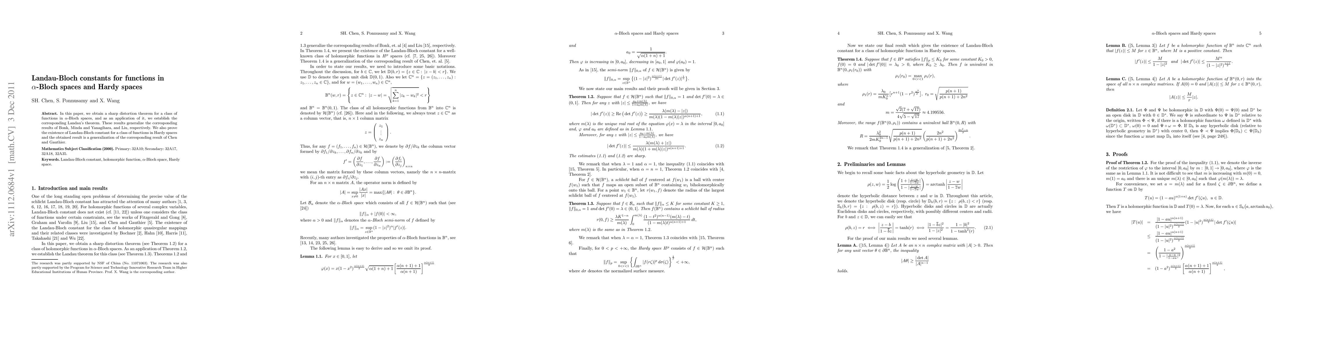 In this paper, we obtain a sharp distortion theorem for a class of functions in $\alpha$-Bloch spaces, and as an application of it, we establish the corresponding Landau's theorem. These results generalize the corresponding results of Bonk, Minda and Yanagihara, and Liu, respectively. We also prove the existence of Landau-Bloch constant for a class of functions in Hardy spaces and the obtained result is a generalization of the corresponding result of Chen and Gauthier.