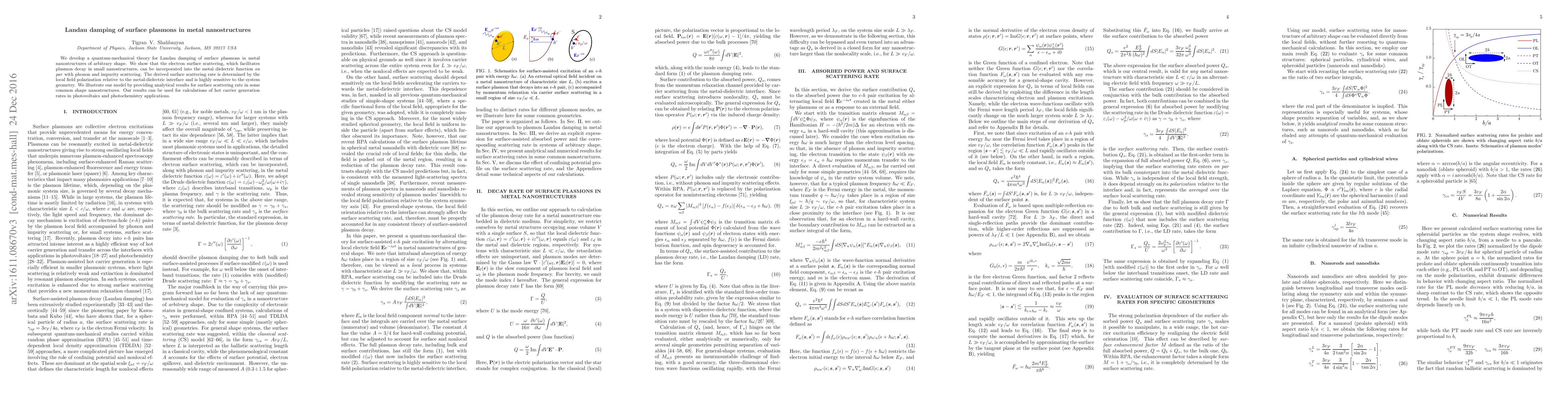 This paper develops a quantum-mechanical theory for Landau damping of surface plasmons in metal nanostructures, showing that electron surface scattering can be incorporated into the metal dielectric function alongside phonon and impurity scattering. The derived surface scattering rate is highly sensitive to the geometry of the system.